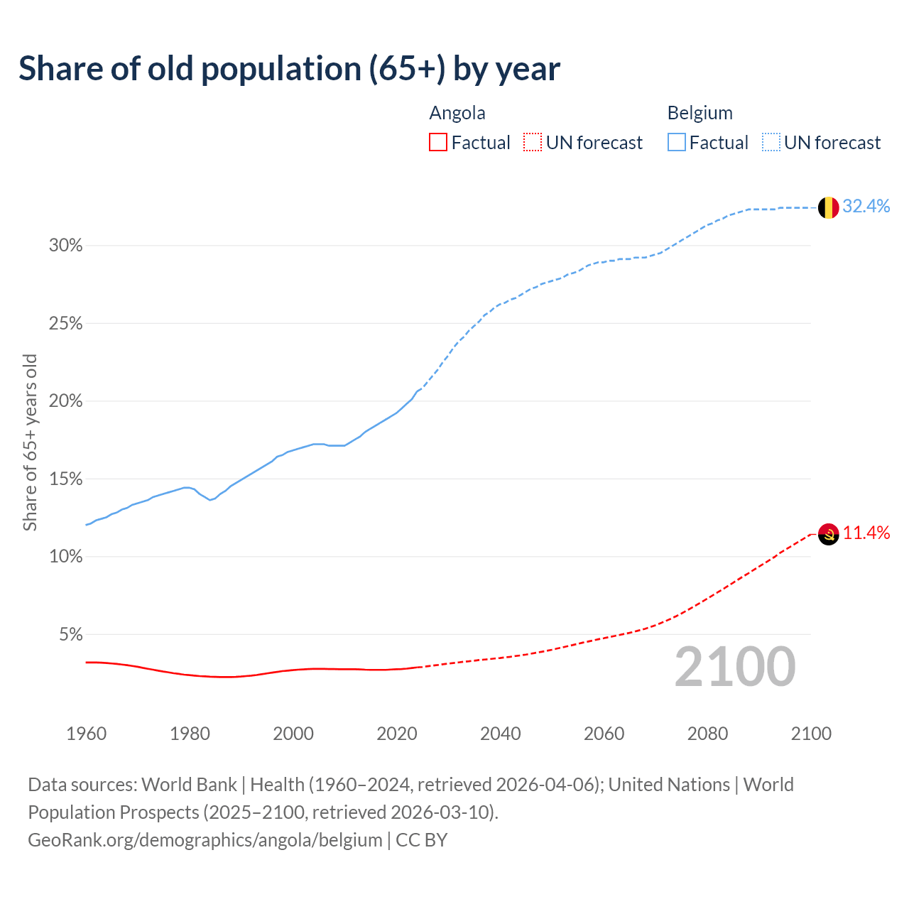- The share of old-age demographic (65+) in Angola is 2.85% vs 20.6% in Belgium.