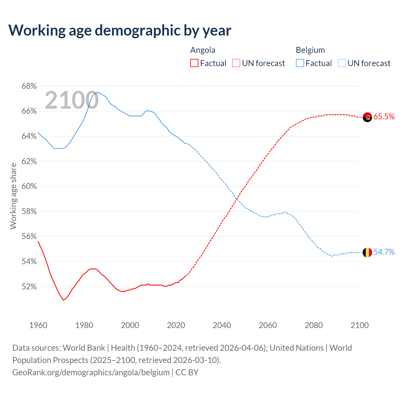 - Angola has 21.4M working age adults (aged 15-64) vs 7.55M in Belgium.