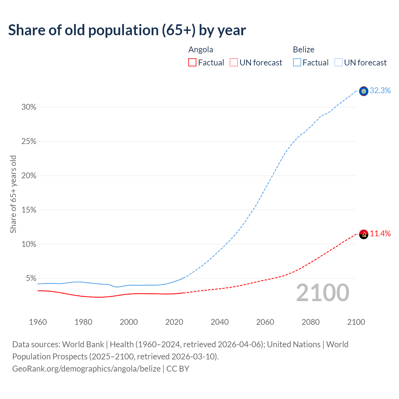 The share of older people aged 65 and over is 2.85% in Angola and 5.02% in Belize. Life expectancy in Angola compared to Belize .
