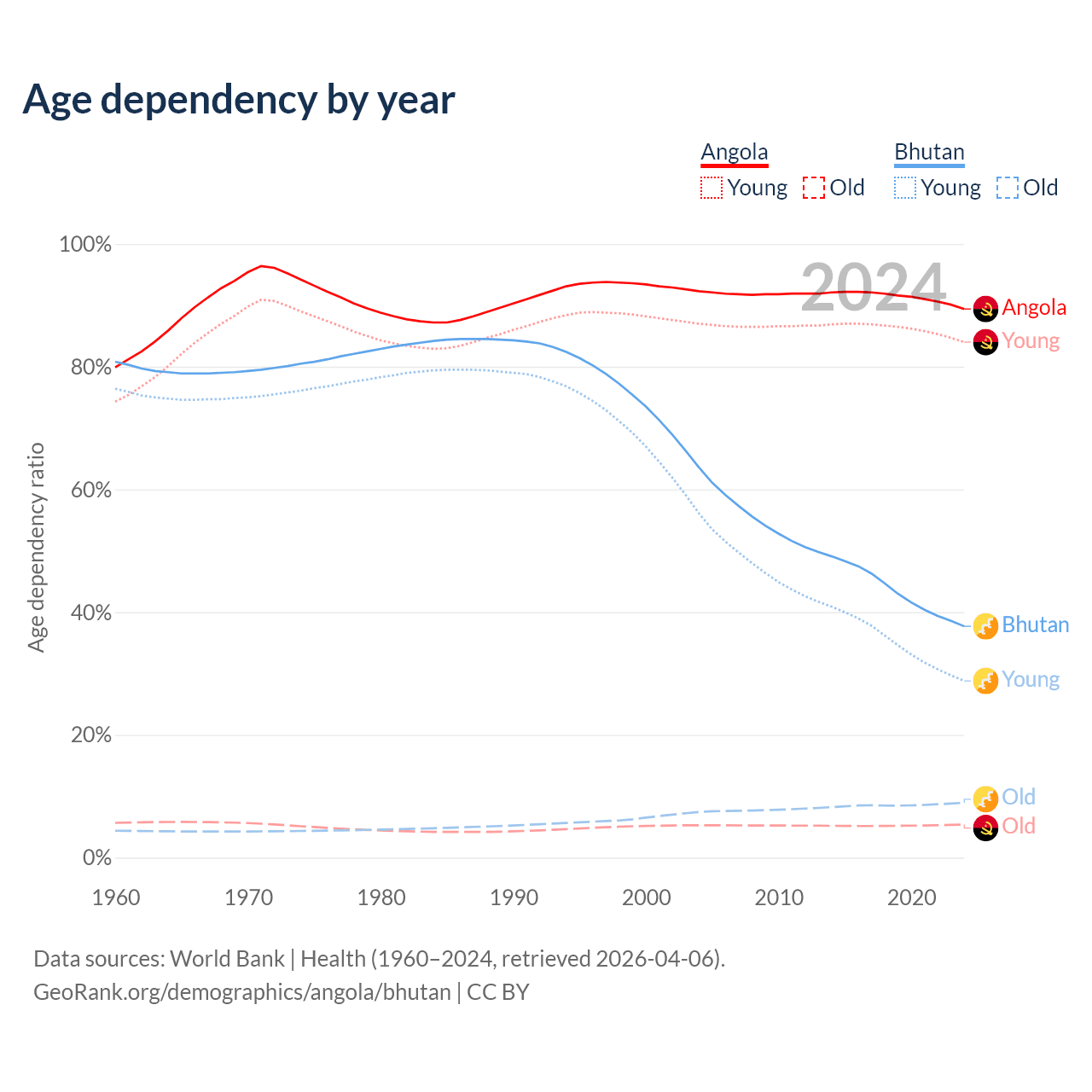 - Angola is ranked 188/196 by median age (oldest to youngest) vs 95/196 for Bhutan.
