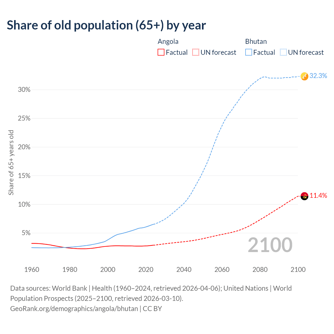 - The share of old-age demographic (65+) in Angola is 2.85% vs 6.49% in Bhutan.
