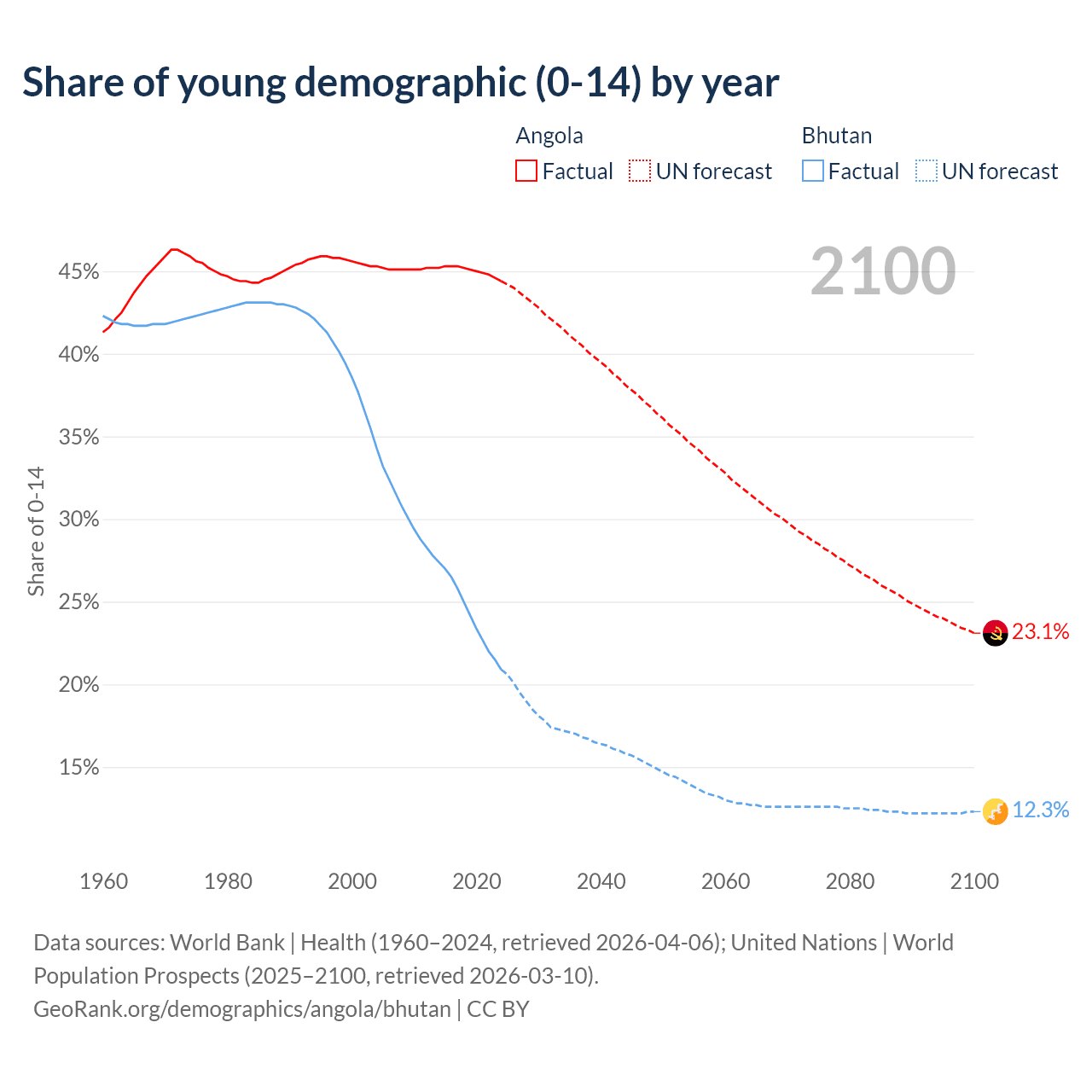 - The share of young demographic (0-15 years old) in Angola is 44.4% vs 20.9% in Bhutan.