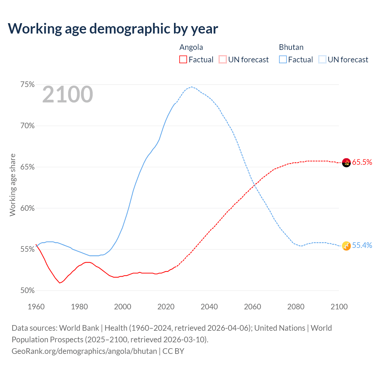 - Angola has 21.4M working age adults (aged 15-64) vs 583K in Bhutan.