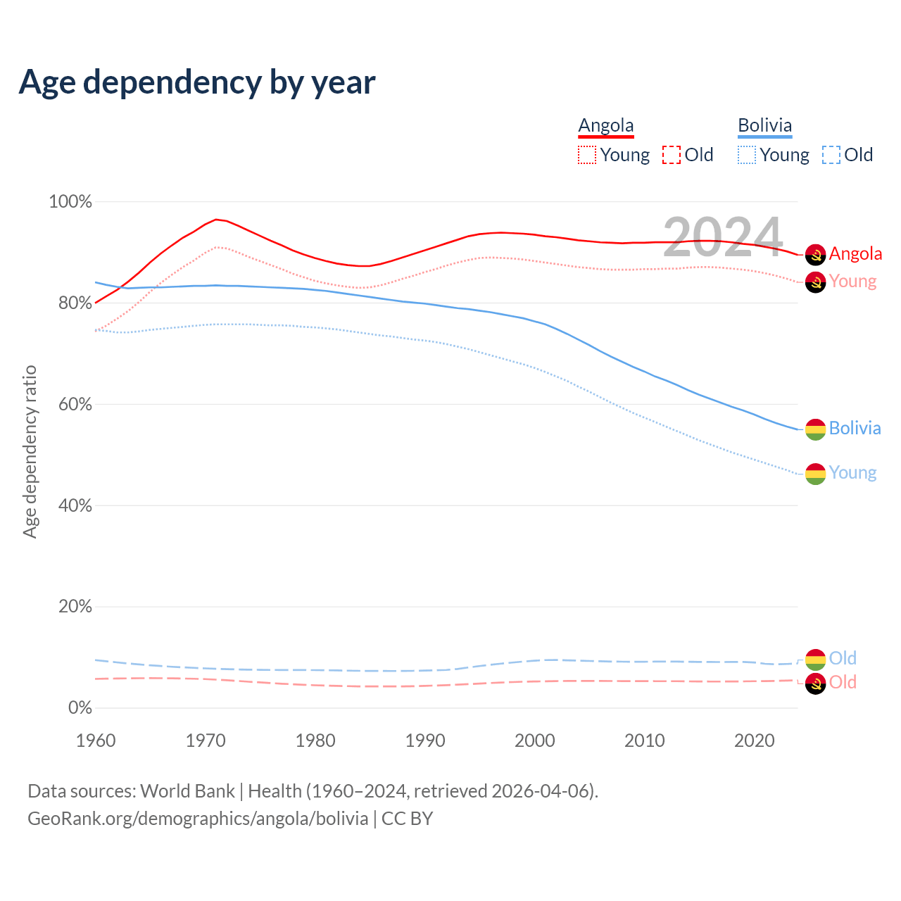 - Angola is ranked 188/196 by median age (oldest to youngest) vs 128/196 for Bolivia.