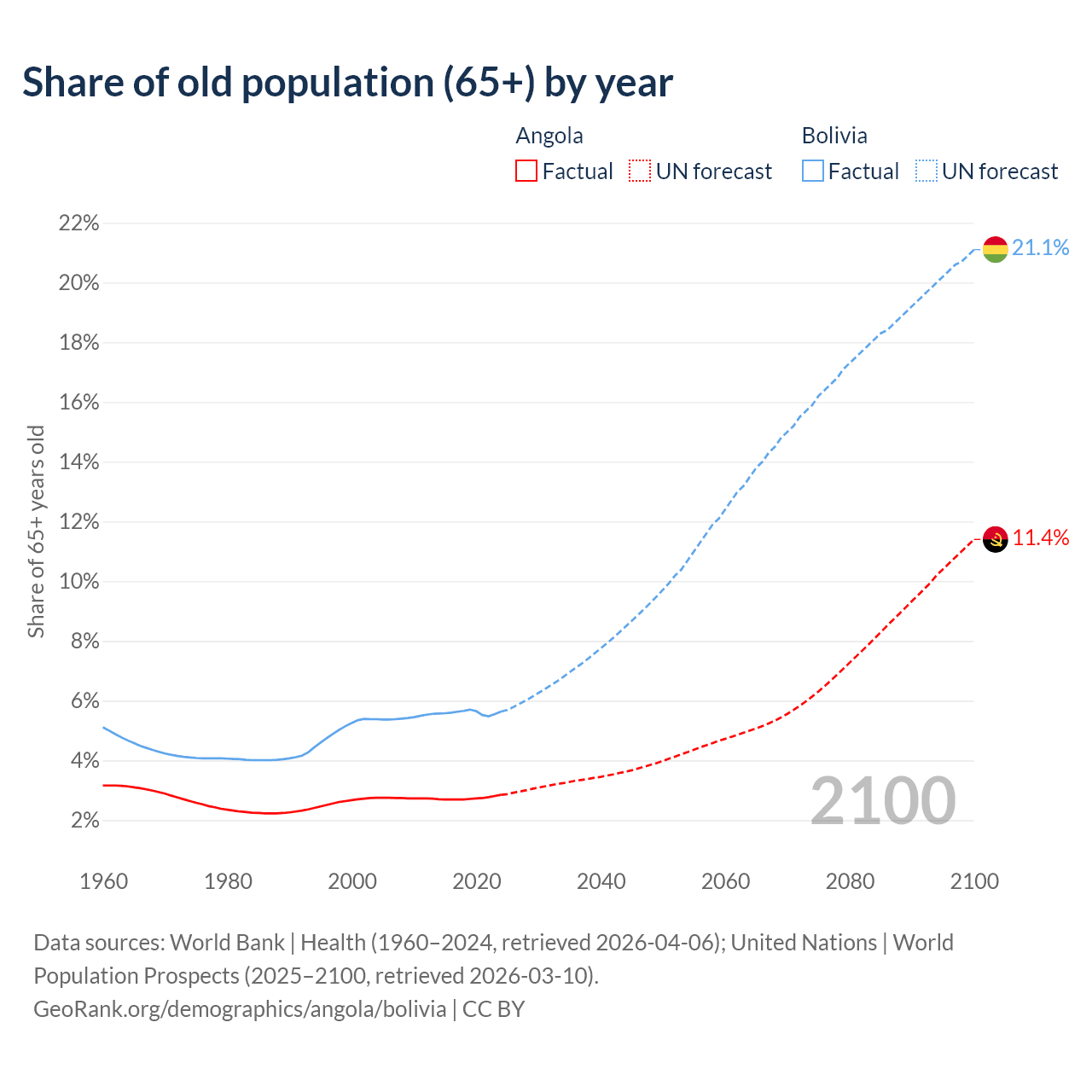 The share of older people aged 65 and over is 2.85% in Angola and 5.64% in Bolivia. Life expectancy in Angola compared to Bolivia .