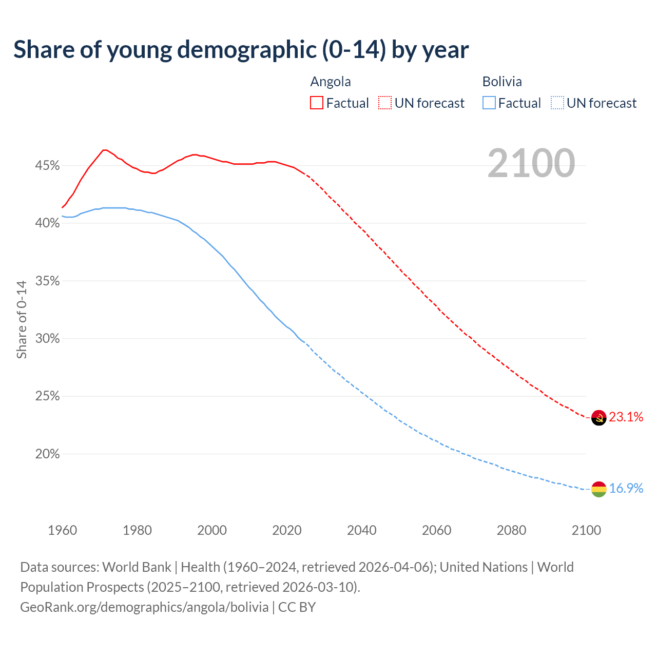- The share of young demographic (0-15 years old) in Angola is 44.4% vs 29.8% in Bolivia.
