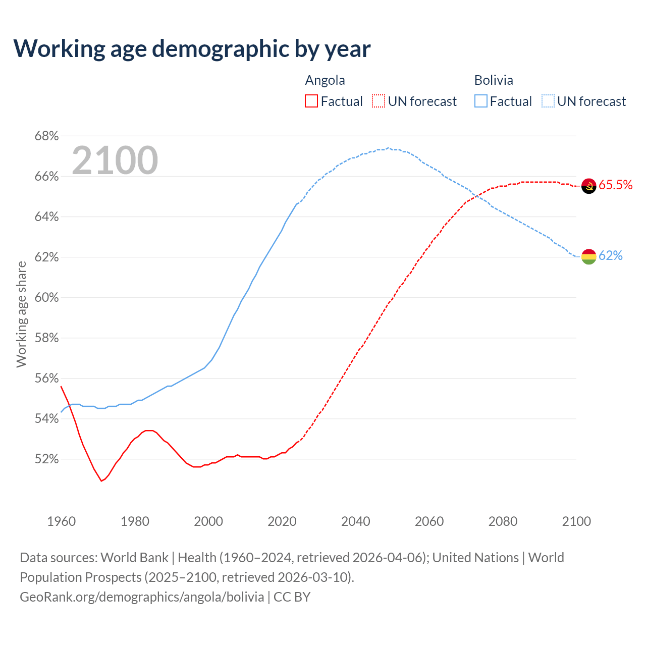 - Angola has 21.4M working age adults (aged 15-64) vs 8.26M in Bolivia.
