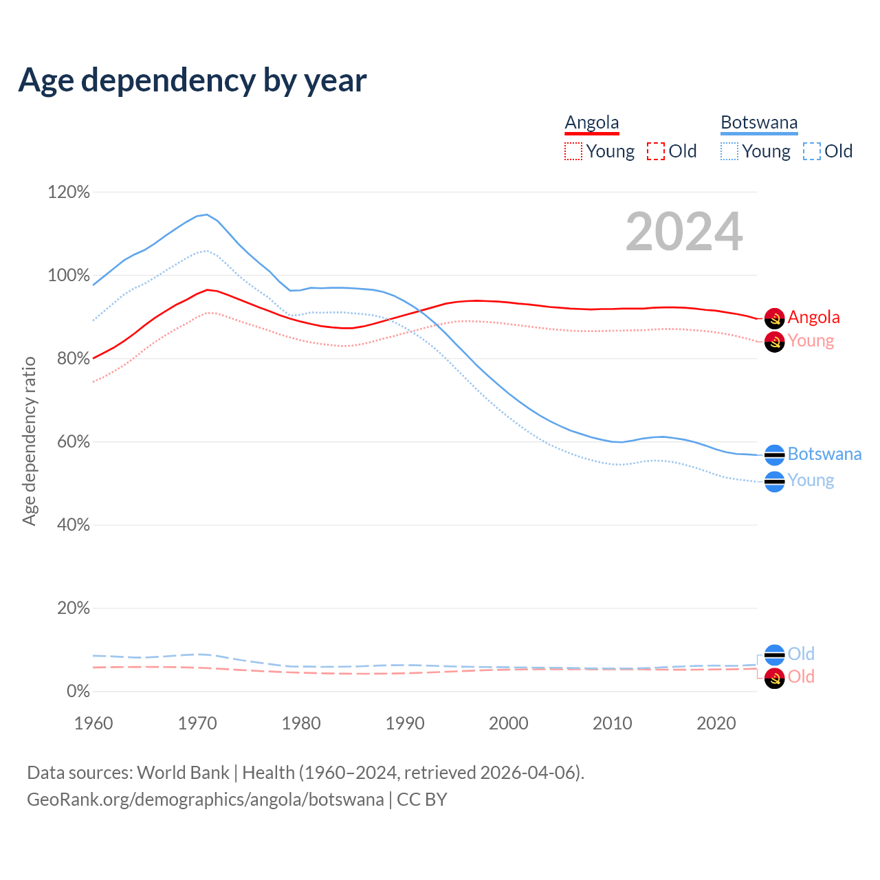 - Angola is ranked 188/196 by median age (oldest to youngest) vs 136/196 for Botswana.