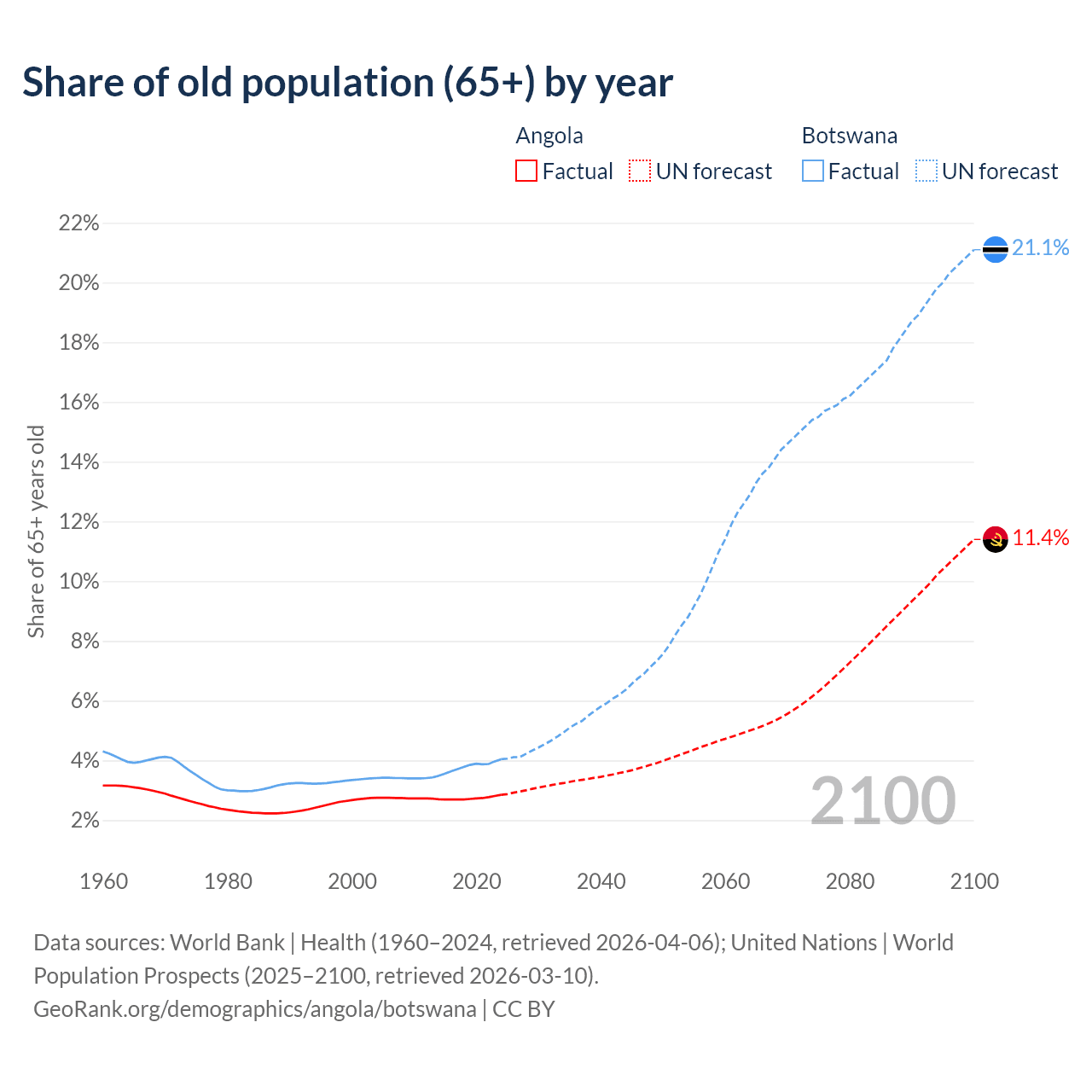 The share of older people aged 65 and over is 2.85% in Angola and 4.04% in Botswana. Life expectancy in Angola compared to Botswana .
