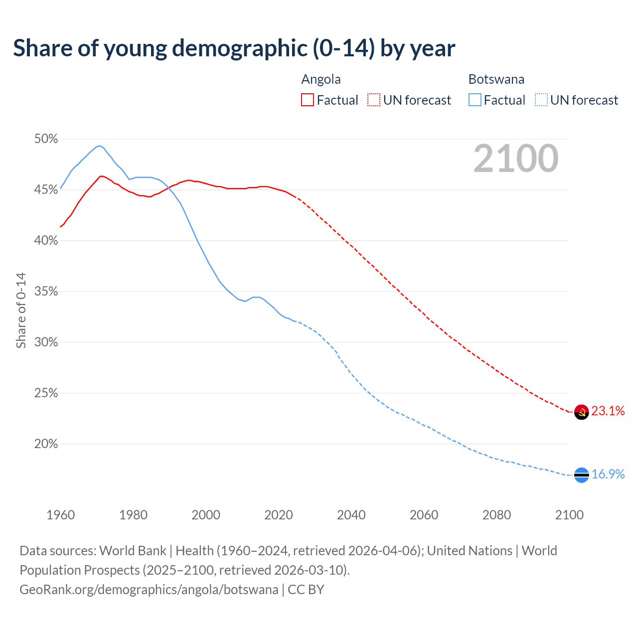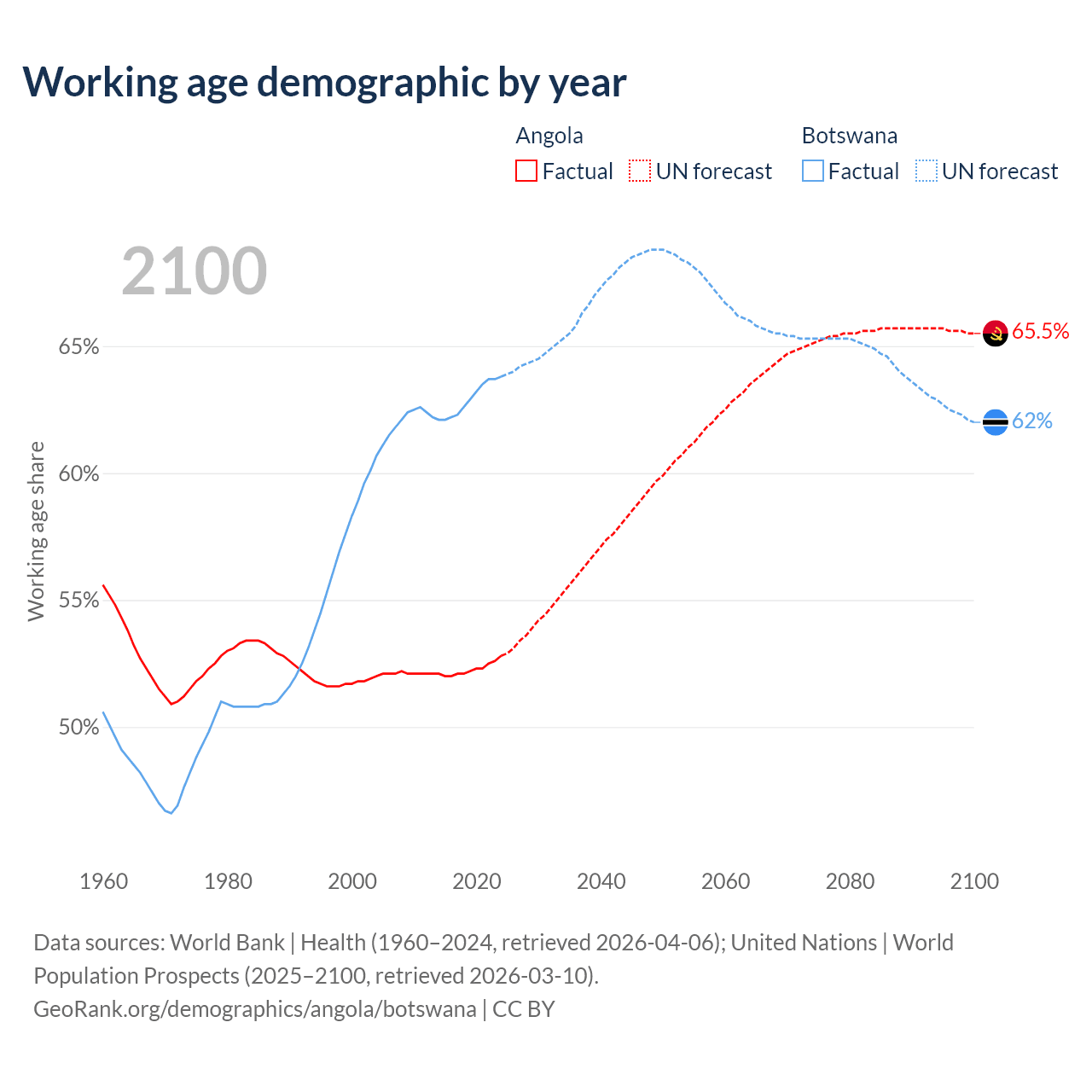 Median age Angola vs Botswana, 1960-2100