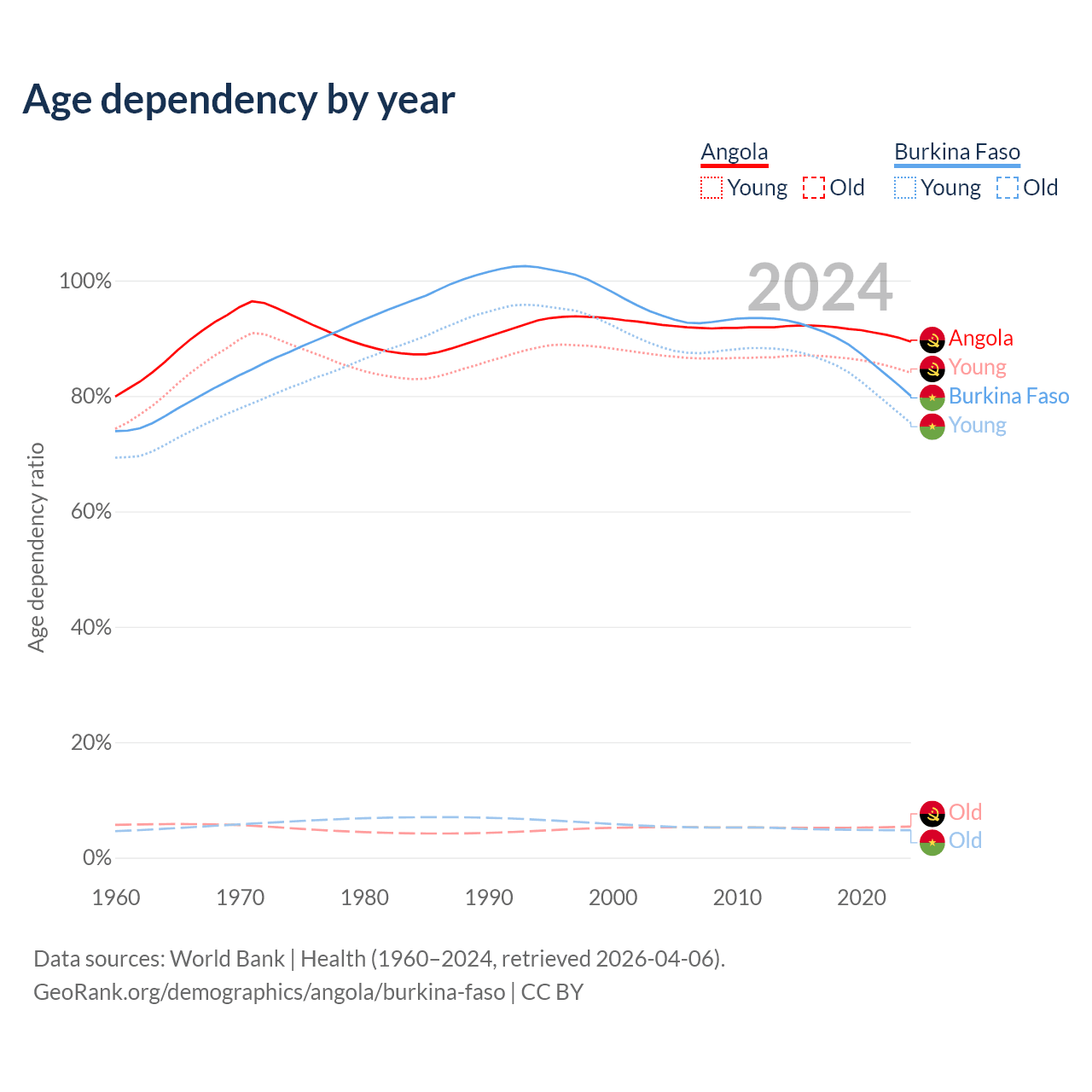 - Angola is ranked 188/196 by median age (oldest to youngest) vs 183/196 for Burkina Faso.