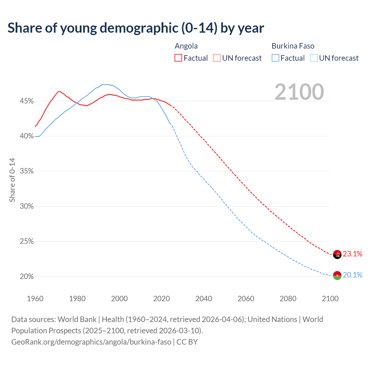 - The share of young demographic (0-15 years old) in Angola is 44.4% vs 41.8% in Burkina Faso.