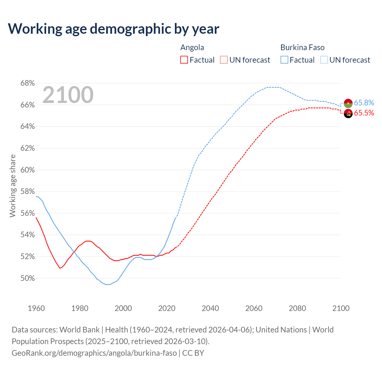 - Angola has 21.4M working age adults (aged 15-64) vs 13.8M in Burkina Faso.