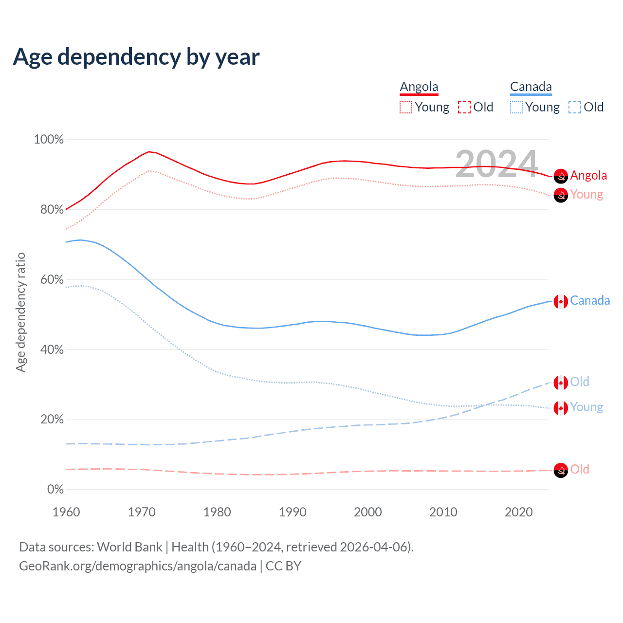 - Angola is ranked 188/196 by median age (oldest to youngest) vs 38/196 for Canada.