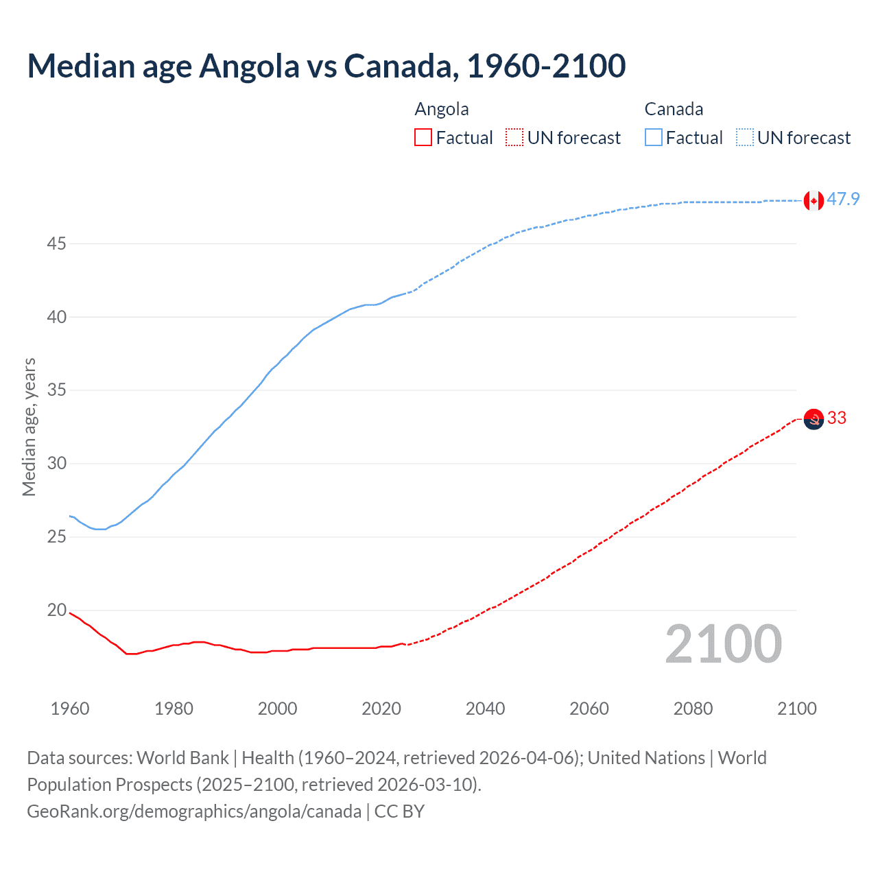 - The median age in Angola is 17.7 years compared to 41.5 years in Canada.