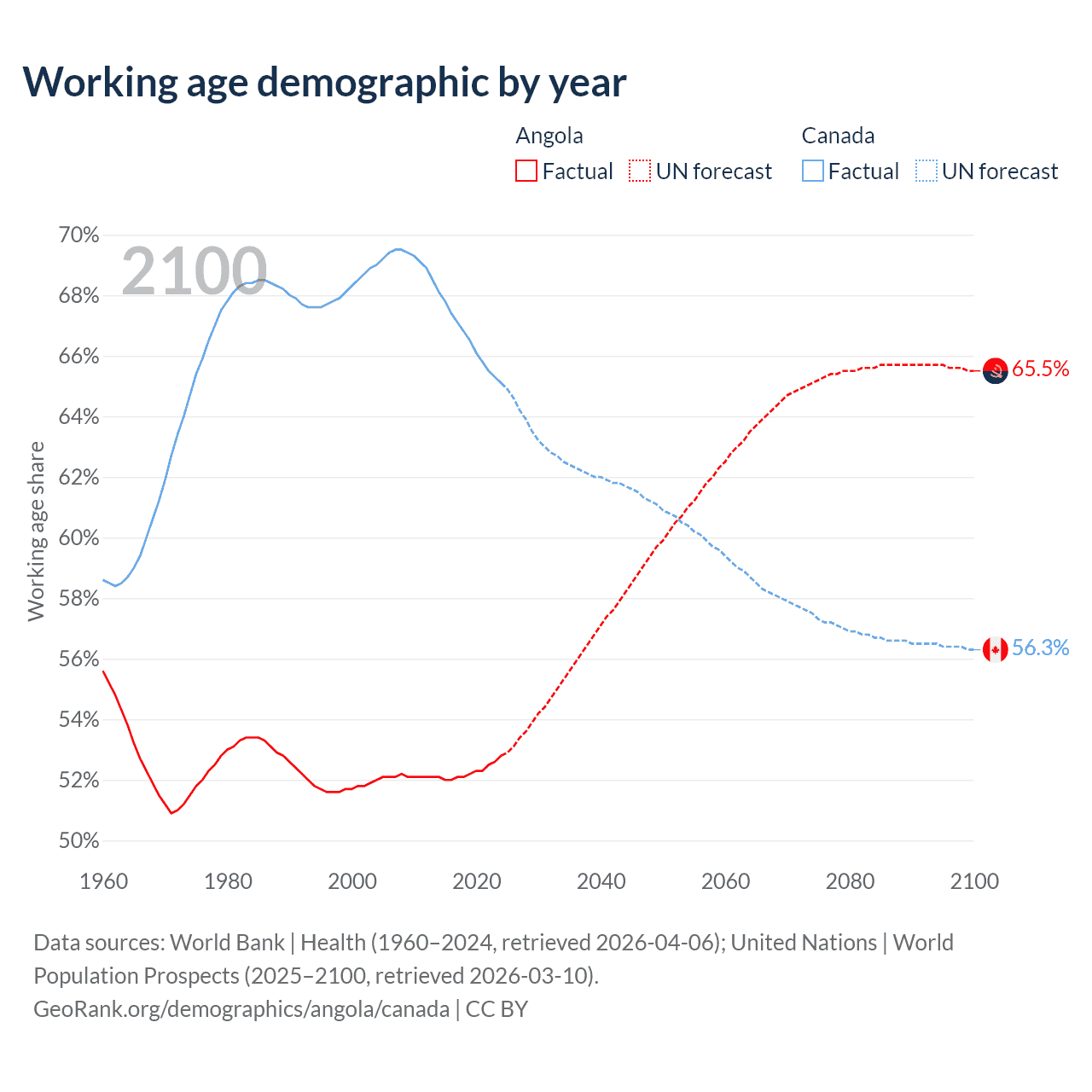 - Angola has 21.4M working age adults (aged 15-64) vs 27.5M in Canada.