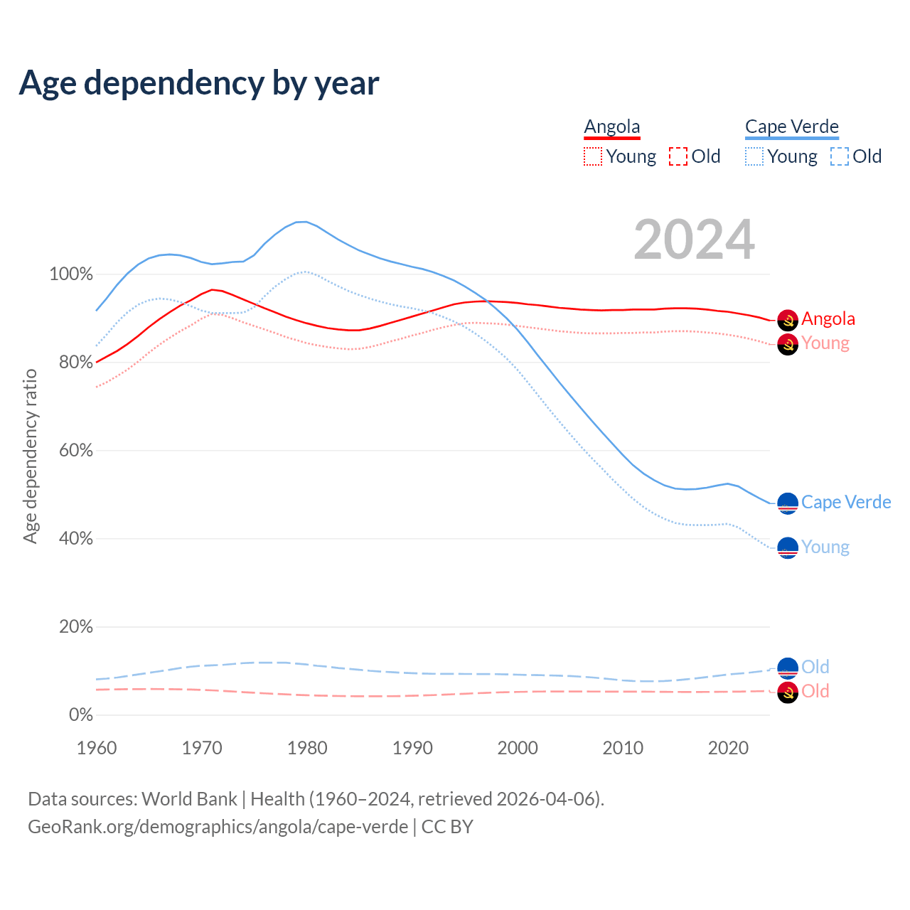 - Angola is ranked 188/196 by median age (oldest to youngest) vs 110/196 for Cape Verde.