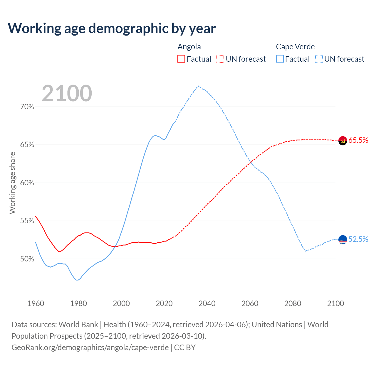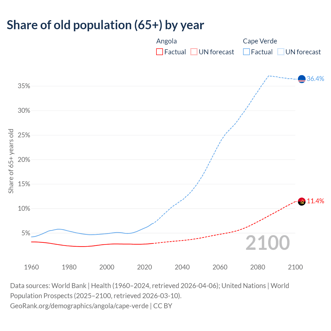 The share of older people aged 65 and over is 2.85% in Angola and 6.86% in Cape Verde. Life expectancy in Angola compared to Cape Verde .