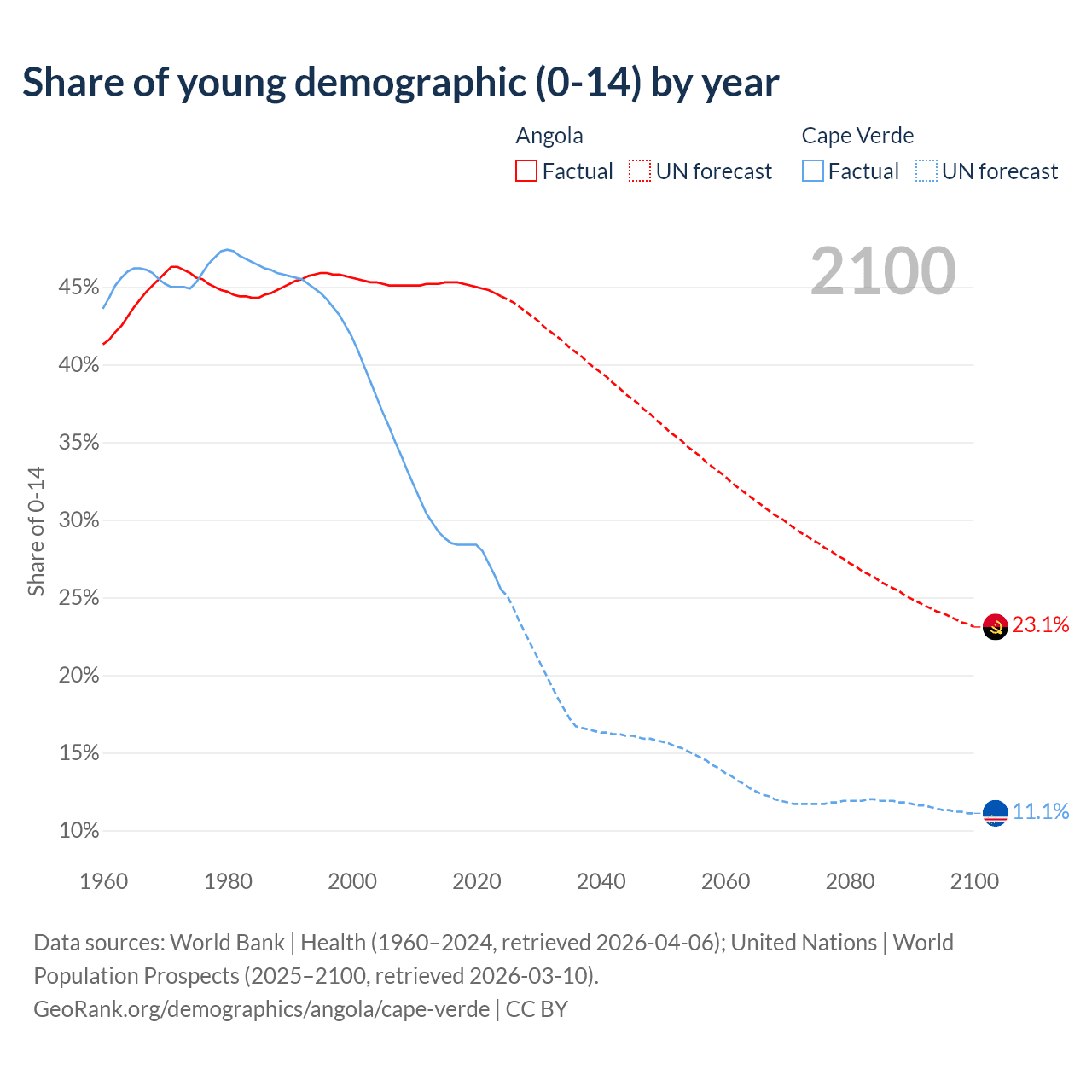 - The share of young demographic (0-15 years old) in Angola is 44.4% vs 25.5% in Cape Verde.