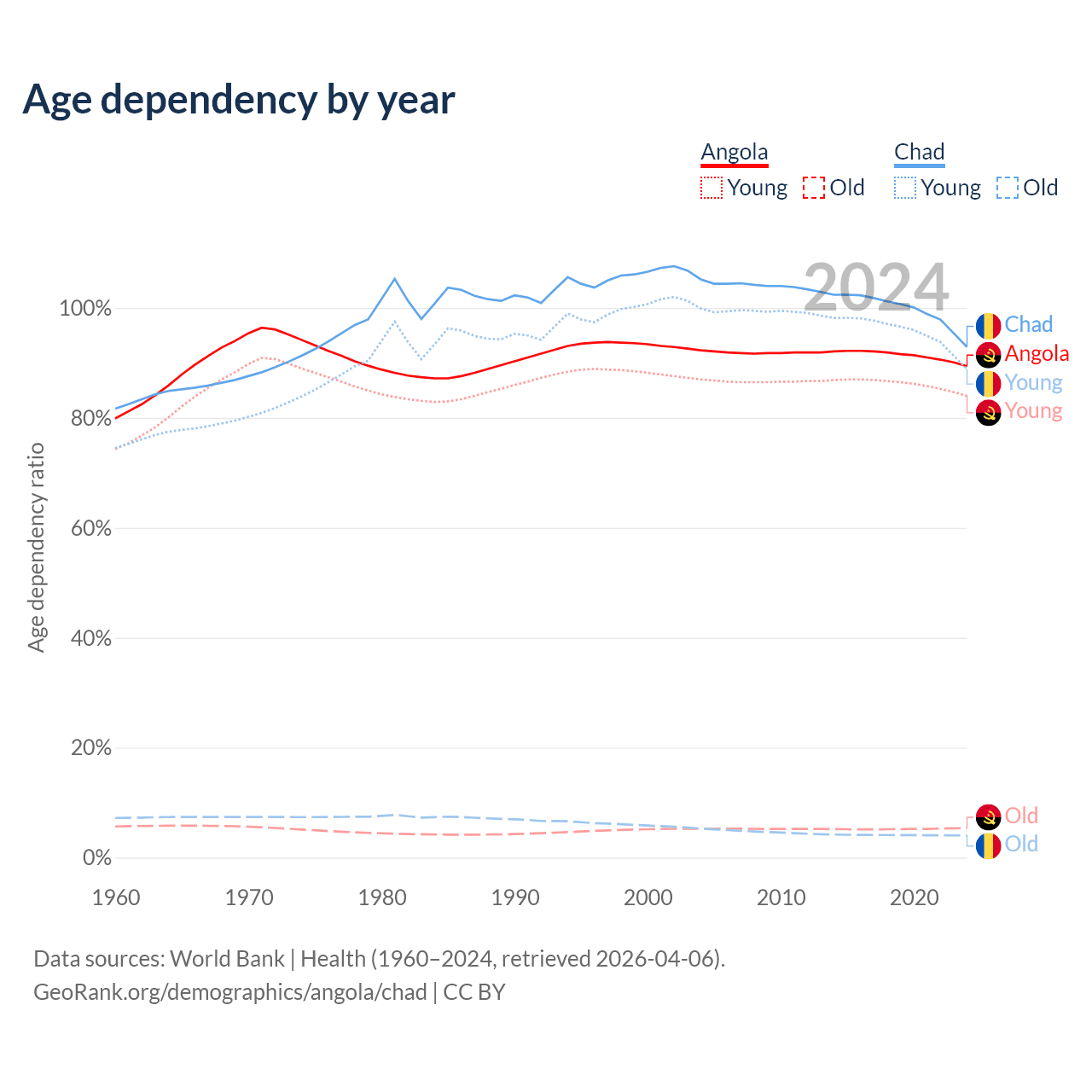 Data sources: World Bank | Health (1960–2024, retrieved 2026-04-06); U.S. Census Bureau (1960–2024, retrieved 2026-02-08).