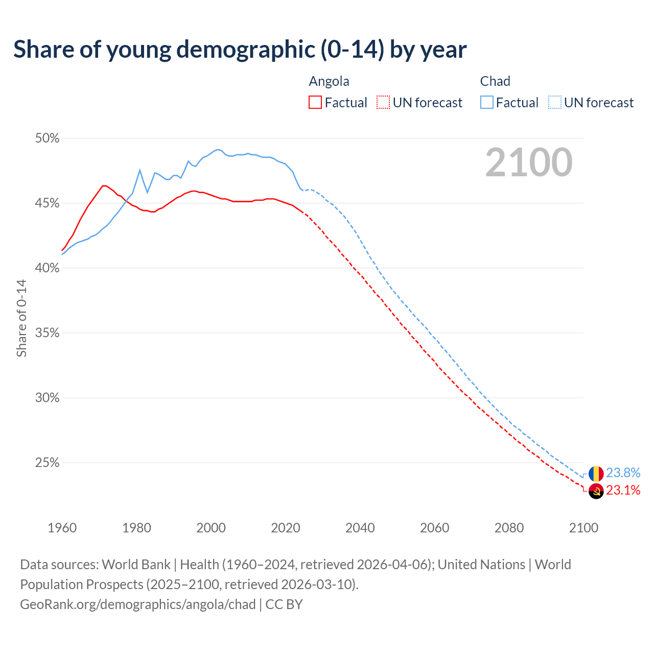 - The share of young demographic (0-15 years old) in Angola is 44.4% vs 46.1% in Chad.
