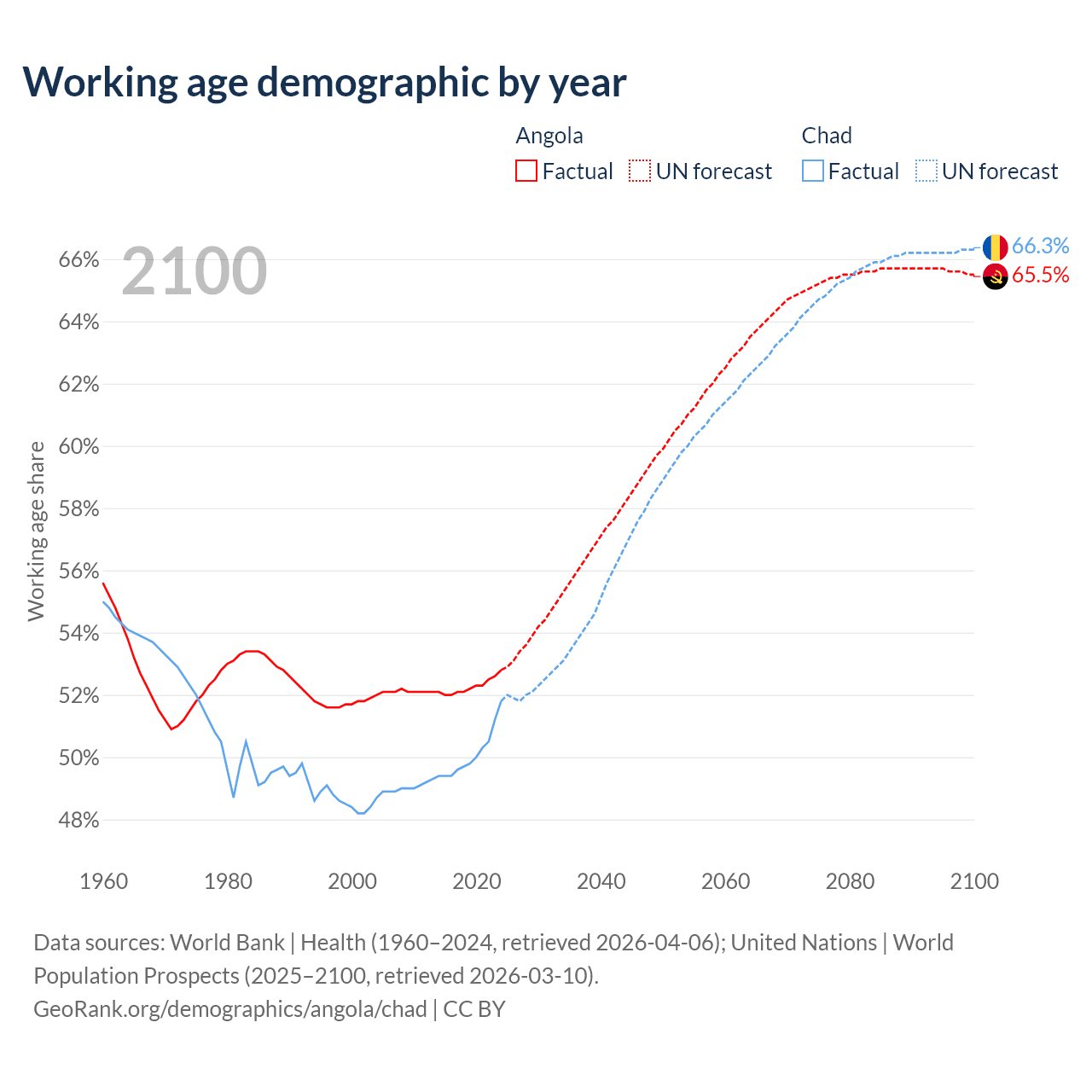 - Angola has 21.4M working age adults (aged 15-64) vs 11.3M in Chad.