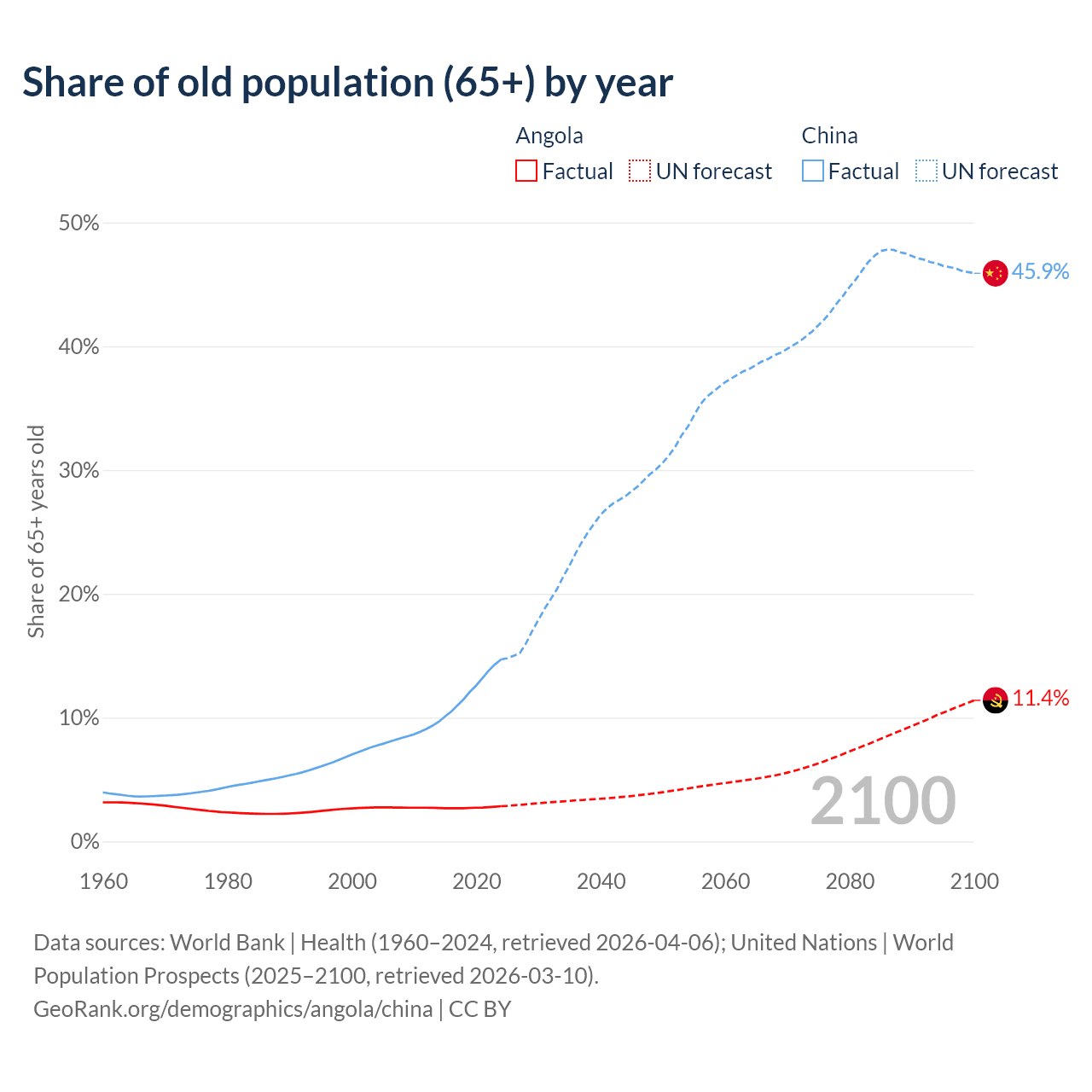 The share of older people aged 65 and over is 2.85% in Angola and 14.7% in China. Life expectancy in Angola compared to China .