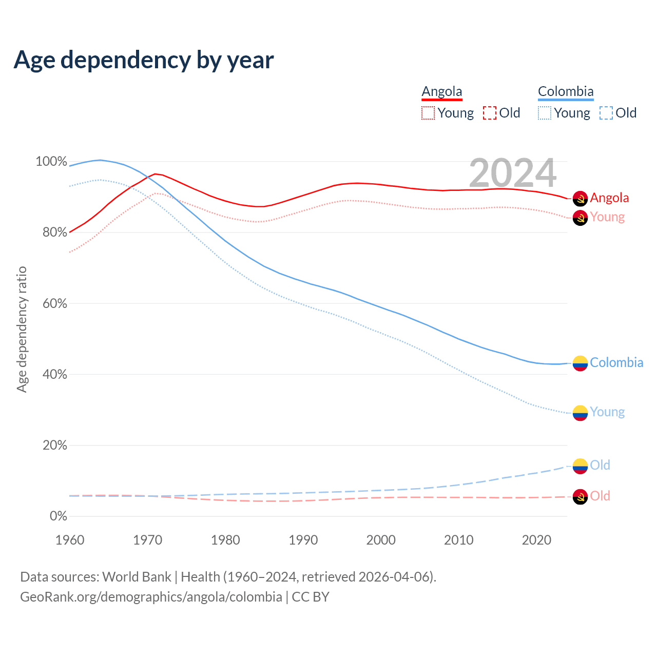 - Angola is ranked 188/196 by median age (oldest to youngest) vs 89/196 for Colombia.
