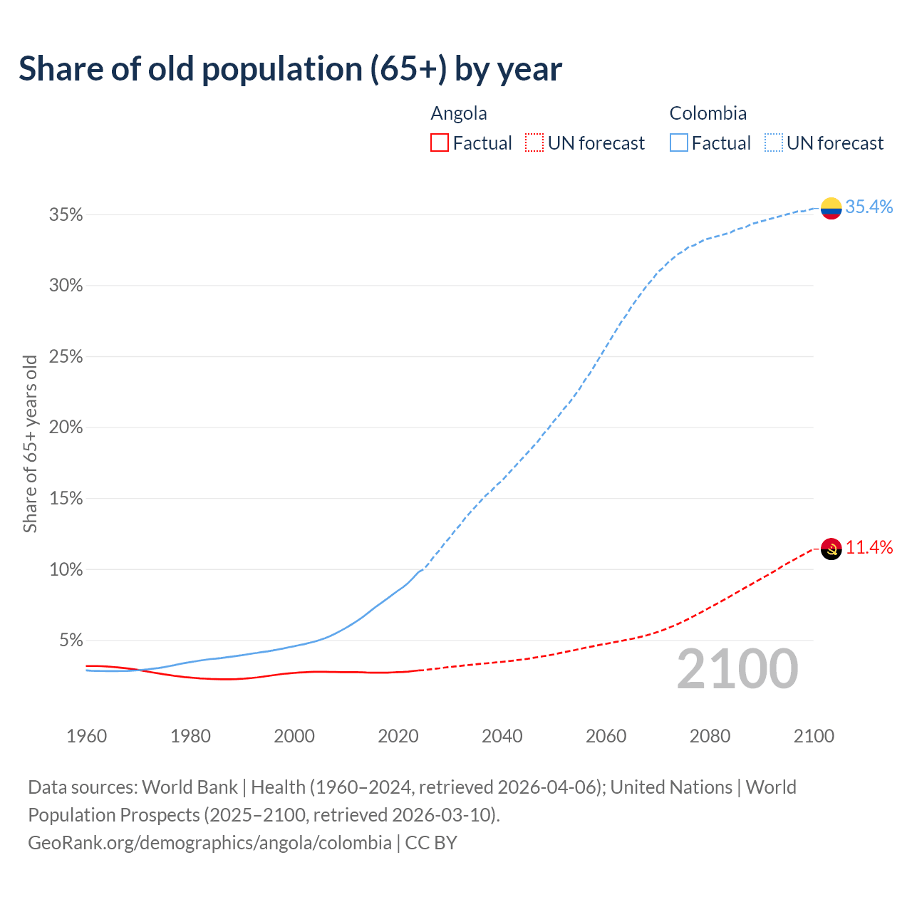 The share of older people aged 65 and over is 2.85% in Angola and 9.78% in Colombia. Life expectancy in Angola compared to Colombia .