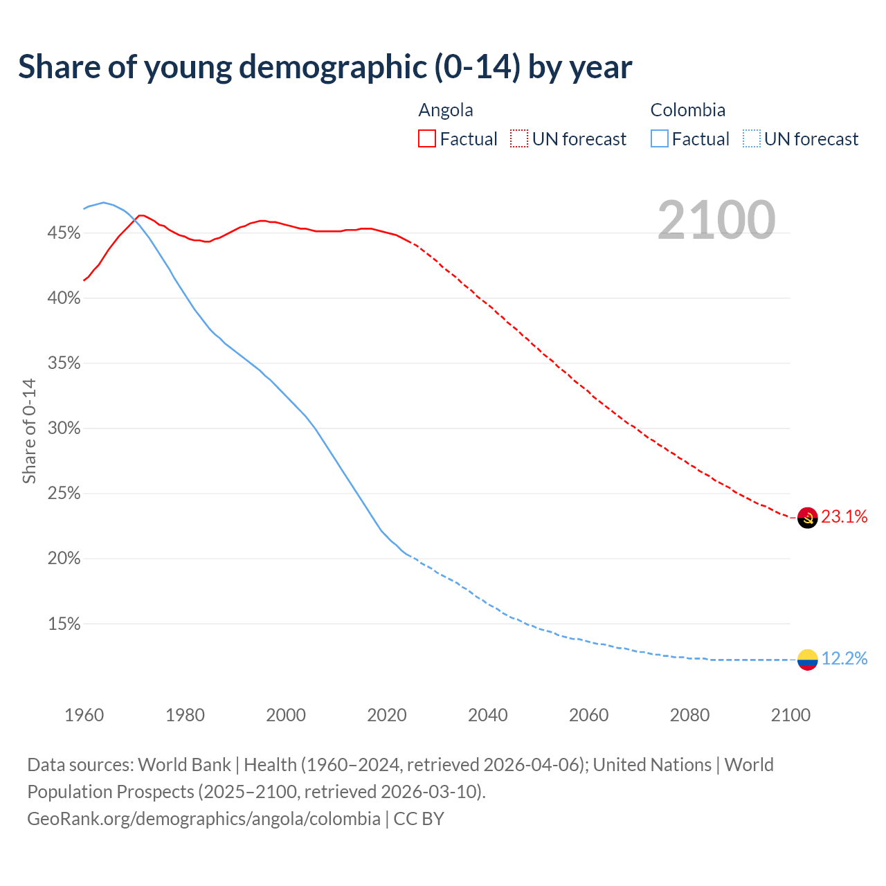 - The share of young demographic (0-15 years old) in Angola is 44.4% vs 20.3% in Colombia.