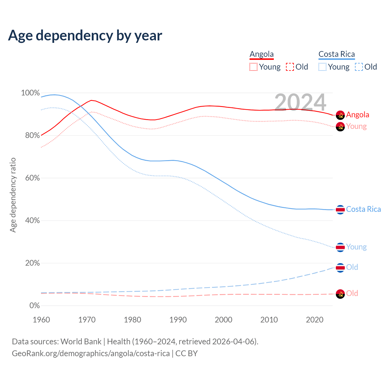 Data sources: World Bank | Health (1960–2024, retrieved 2026-04-06); U.S. Census Bureau (1960–2024, retrieved 2026-02-08).