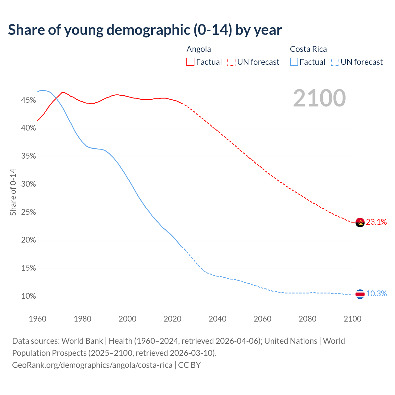 - The share of young demographic (0-15 years old) in Angola is 44.4% vs 18.8% in Costa Rica.