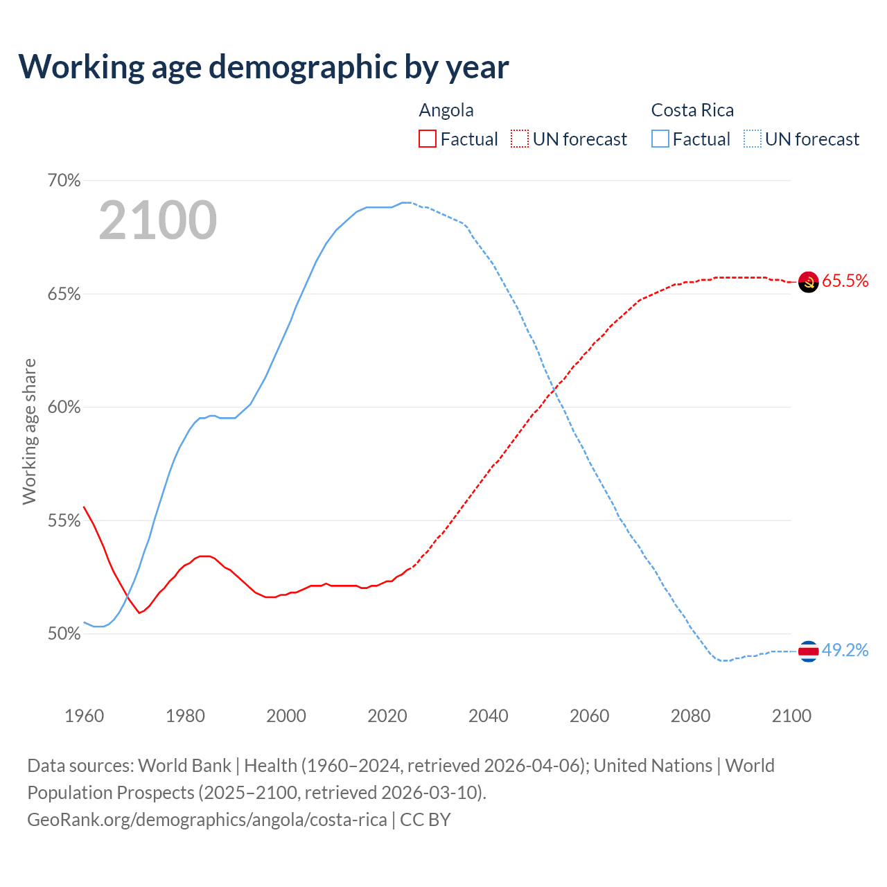 The share of older people aged 65 and over is 2.85% in Angola and 12.2% in Costa Rica. Life expectancy in Angola compared to Costa Rica .