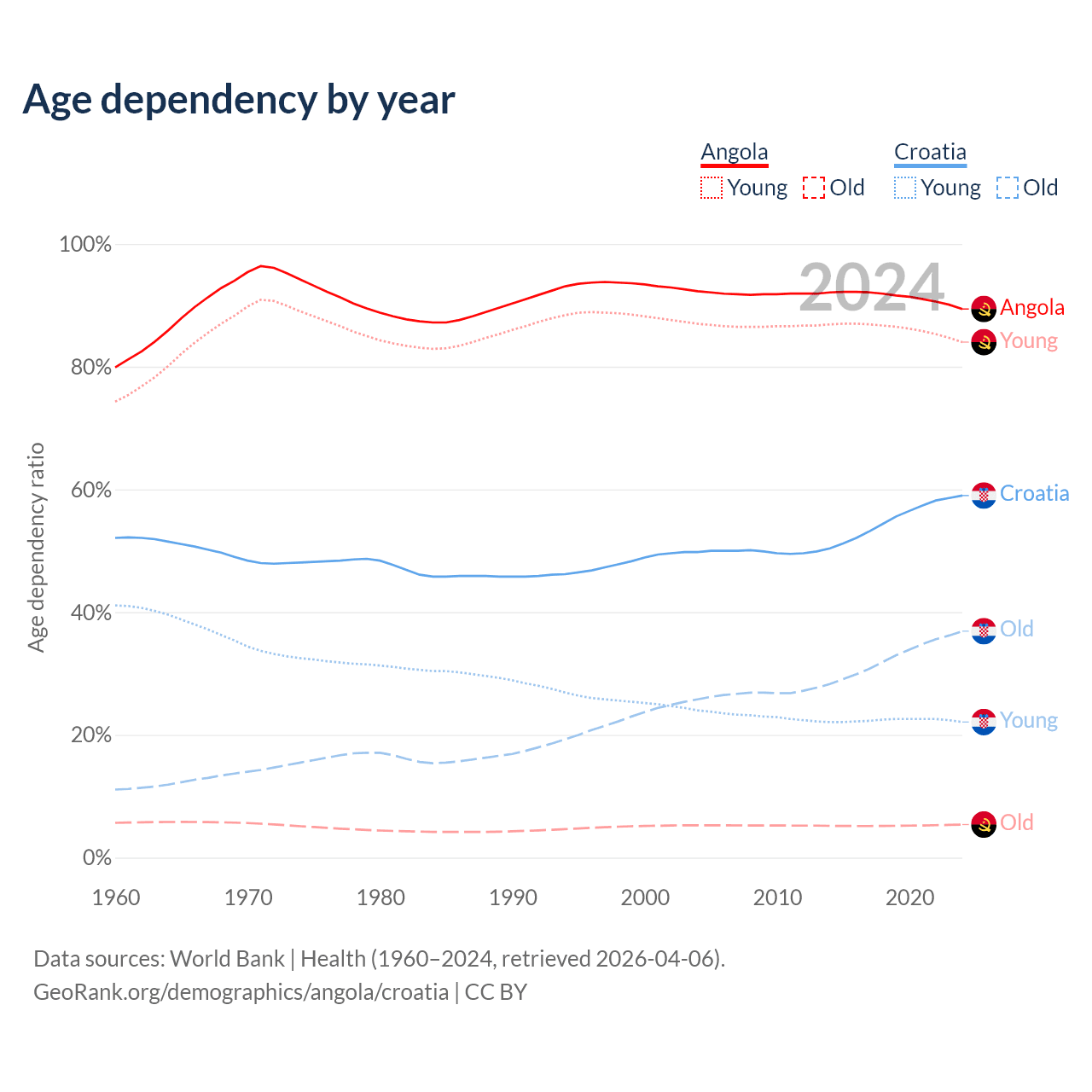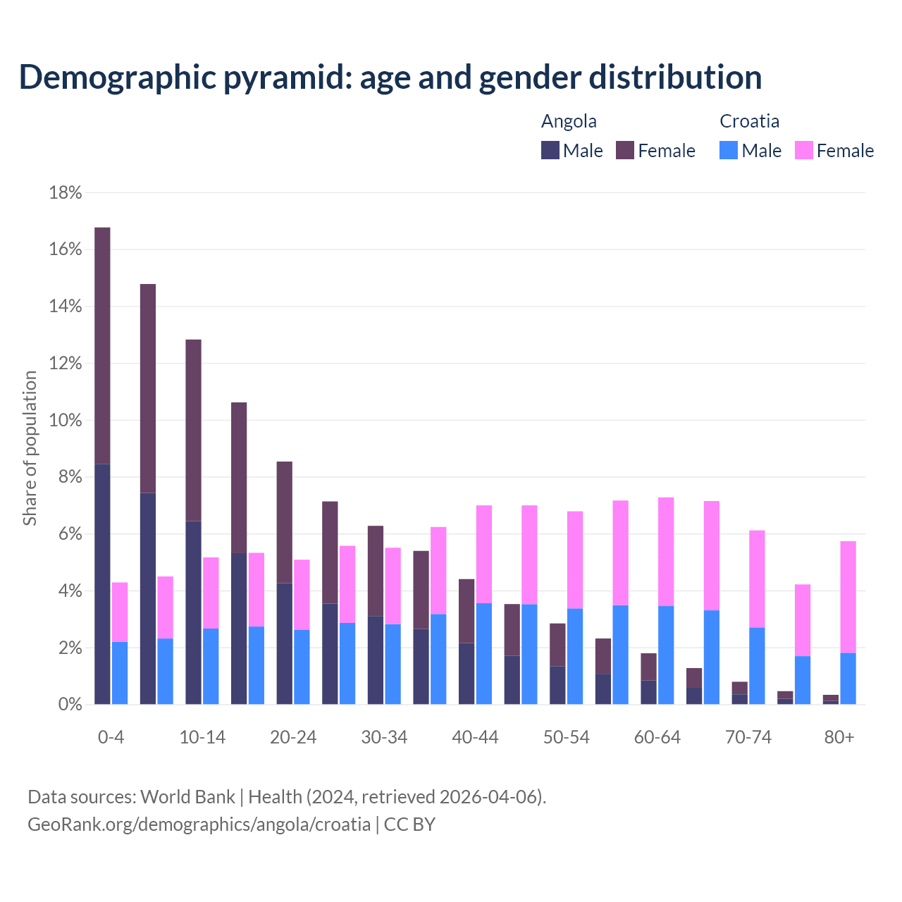 - Angola is ranked 188/196 by median age (oldest to youngest) vs 11/196 for Croatia.