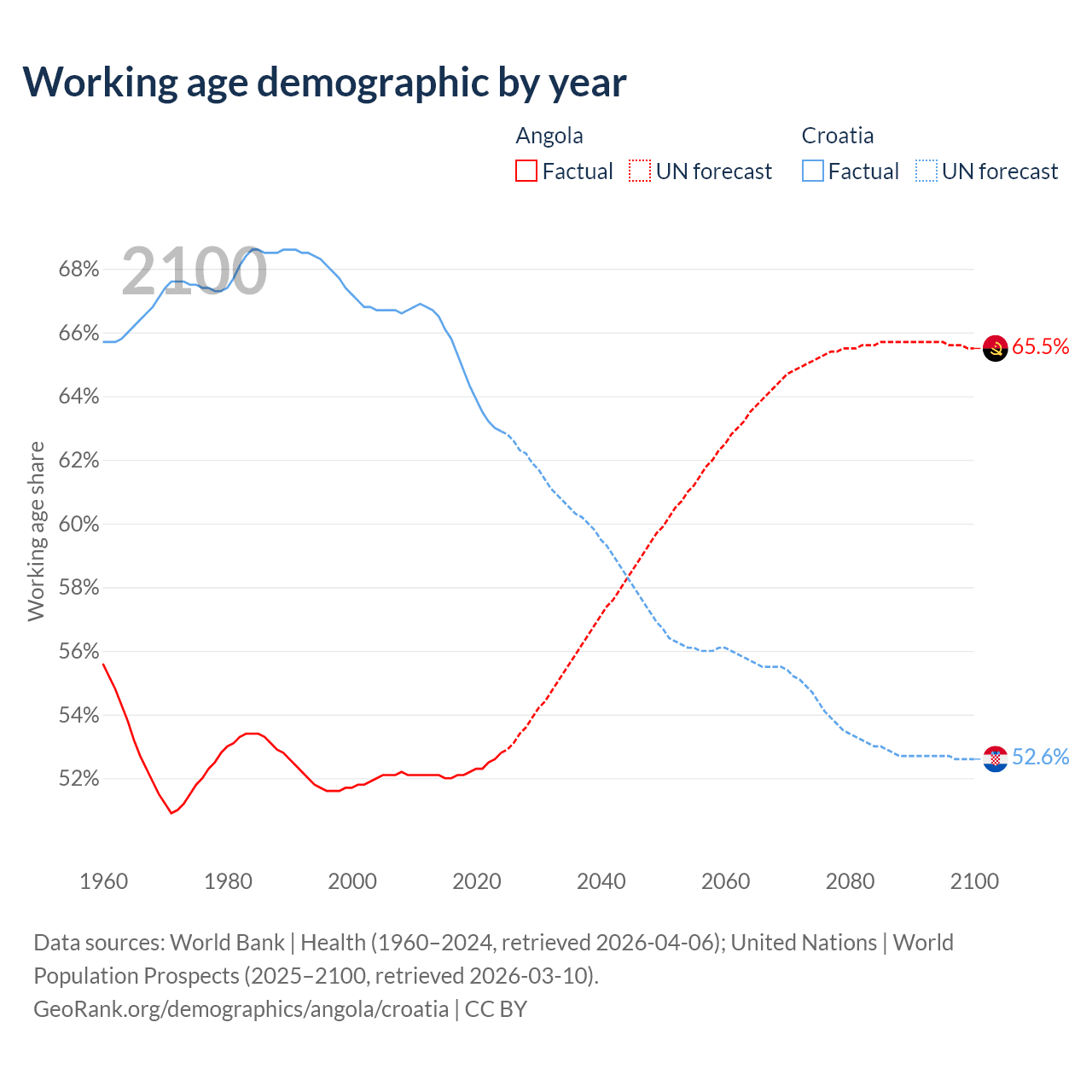 - Angola has 21.4M working age adults (aged 15-64) vs 2.4M in Croatia.
