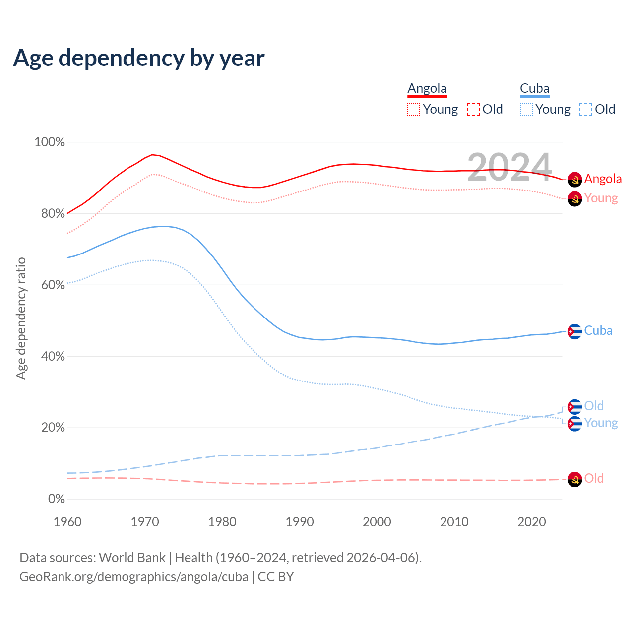 - Angola is ranked 188/196 by median age (oldest to youngest) vs 27/196 for Cuba.