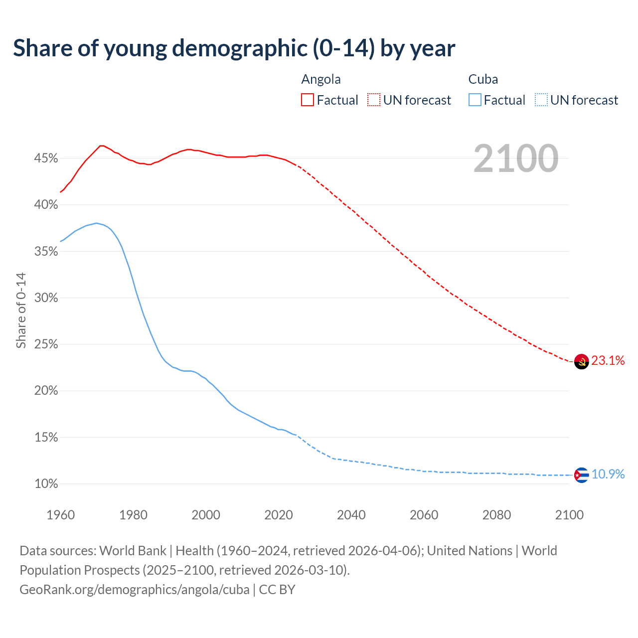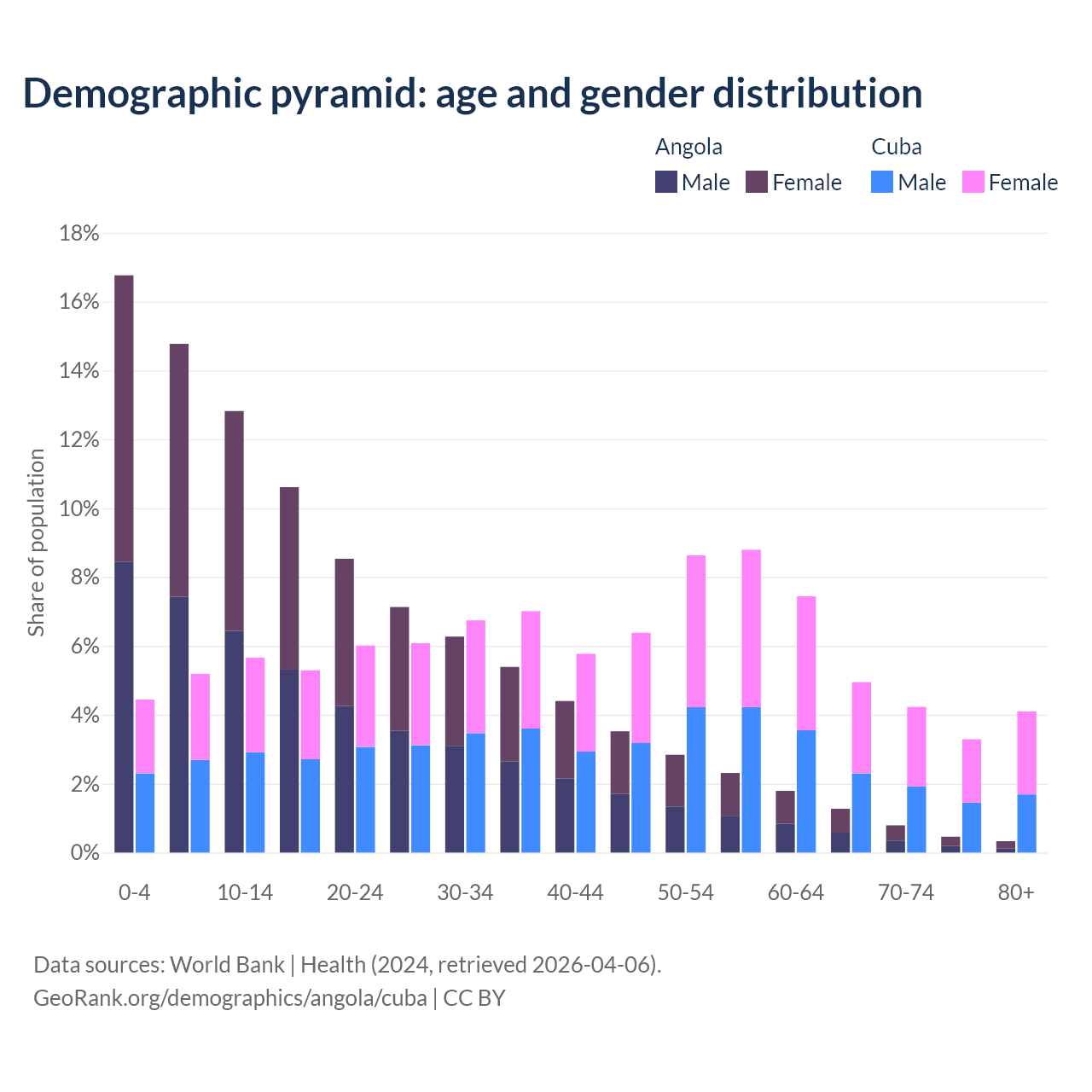 - As of 2026, the population of Angola is 40.6M vs 10.9M in Cuba - 3.72 times difference.