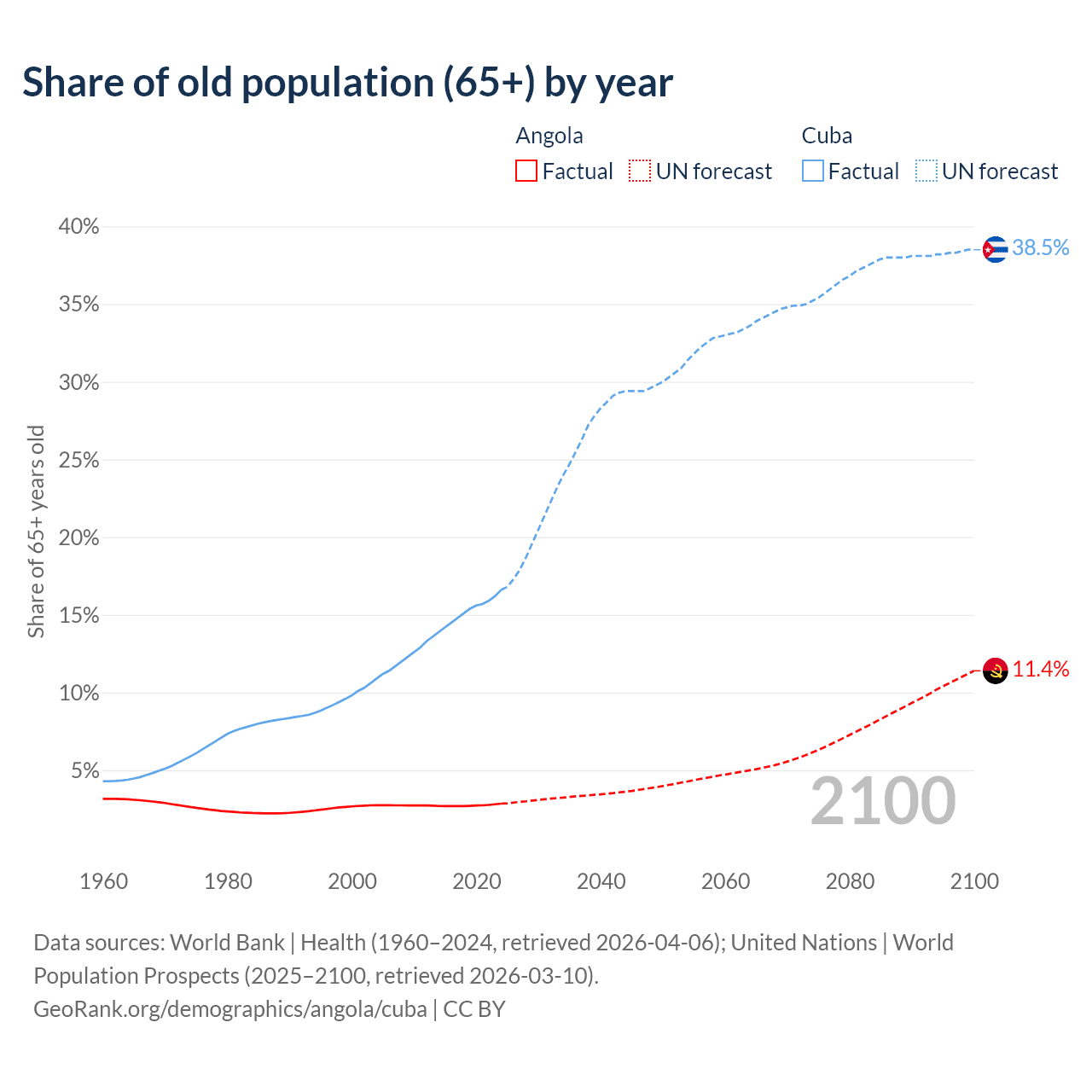 - The share of old-age demographic (65+) in Angola is 2.85% vs 16.6% in Cuba.
