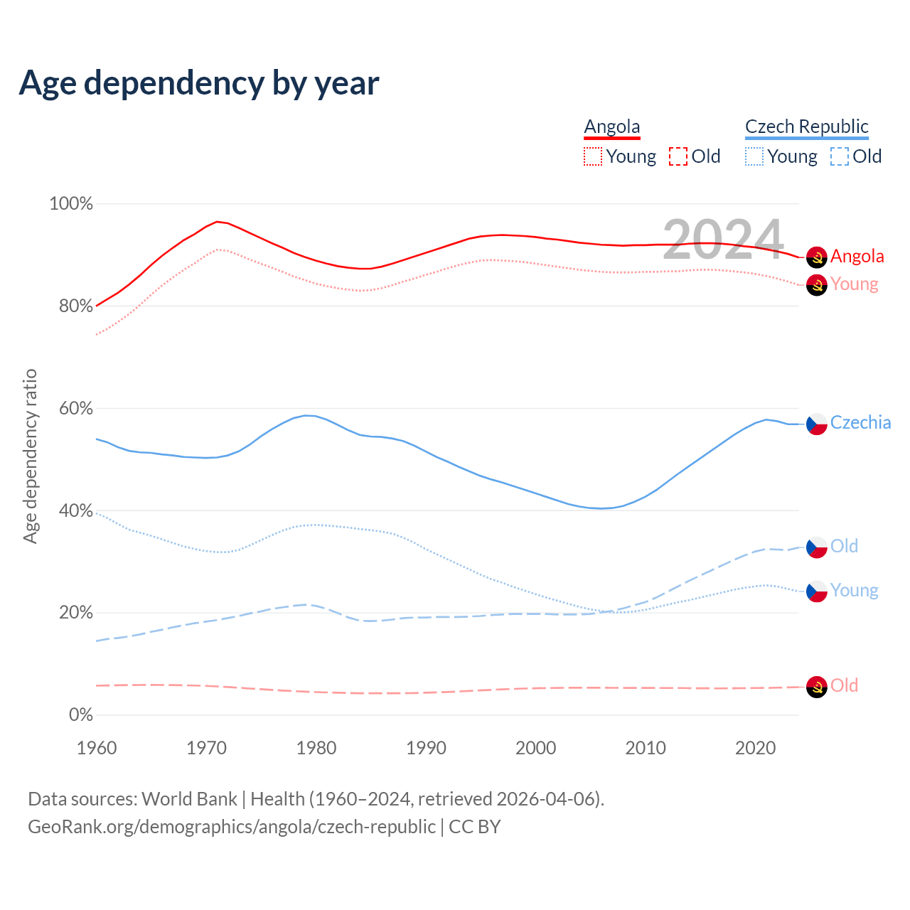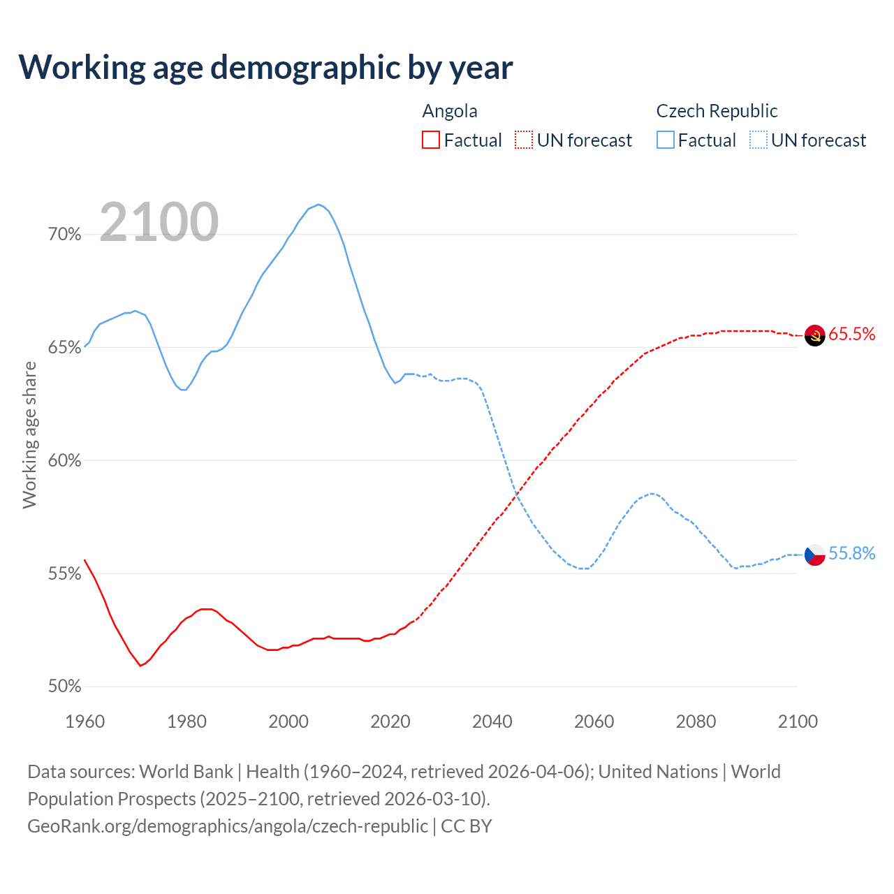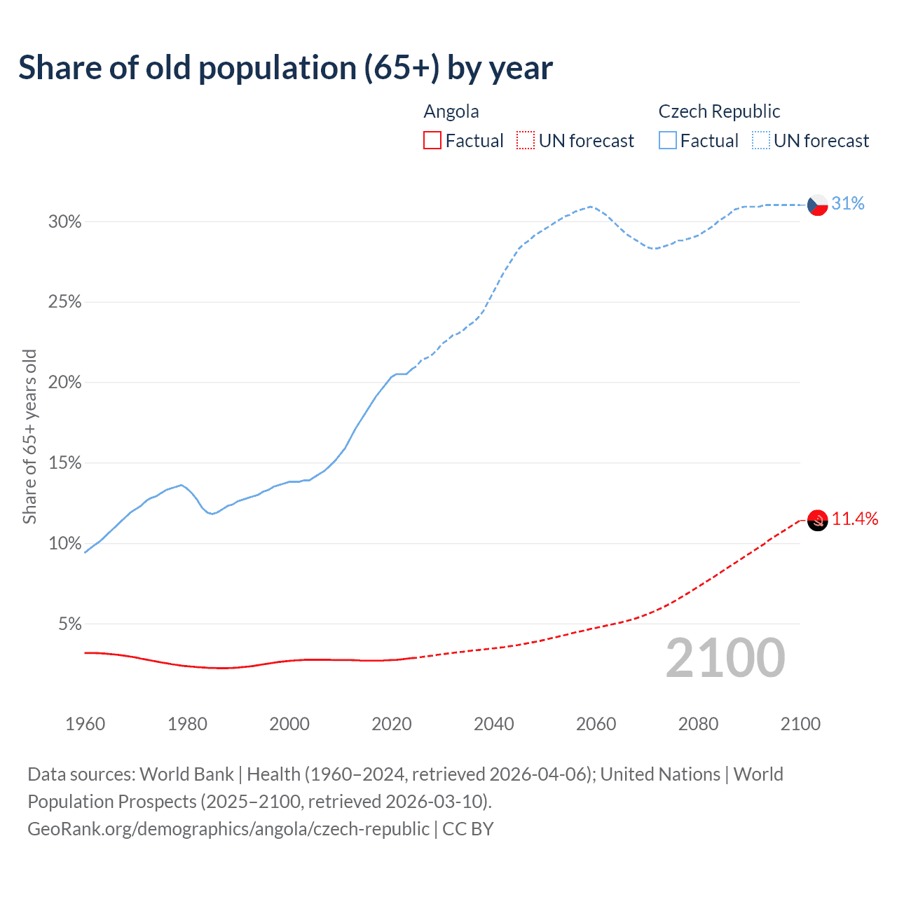 The share of older people aged 65 and over is 2.85% in Angola and 20.8% in the Czech Republic. Life expectancy in Angola compared to the Czech Republic .