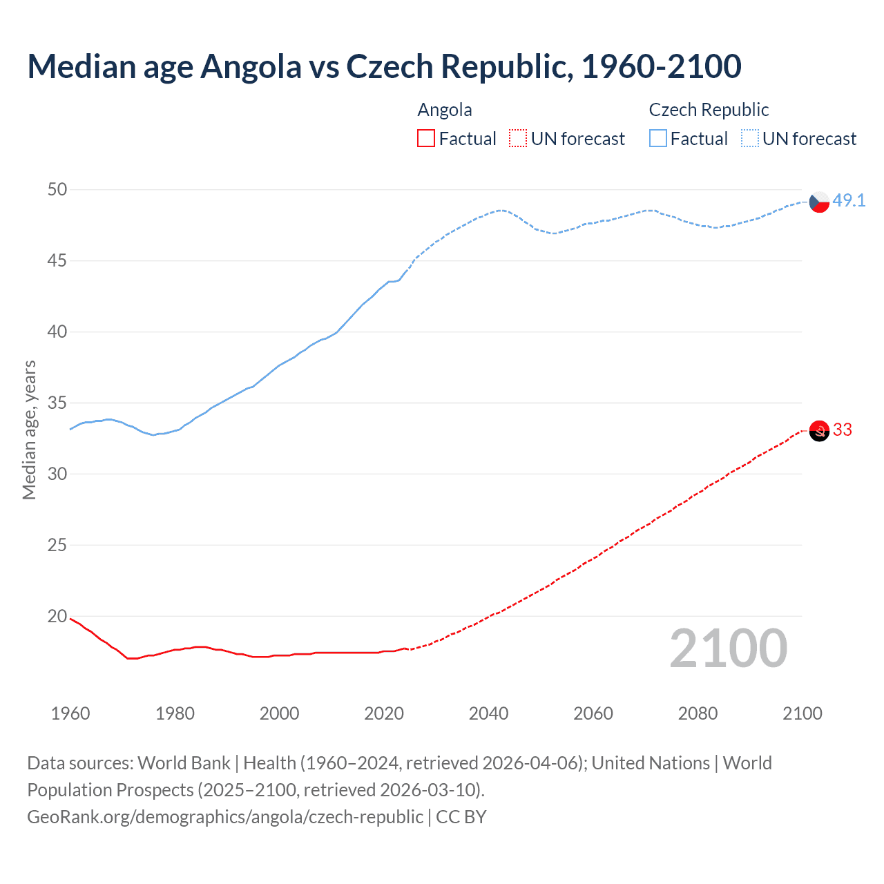 Median age Angola vs Czech Republic, 1960-2100