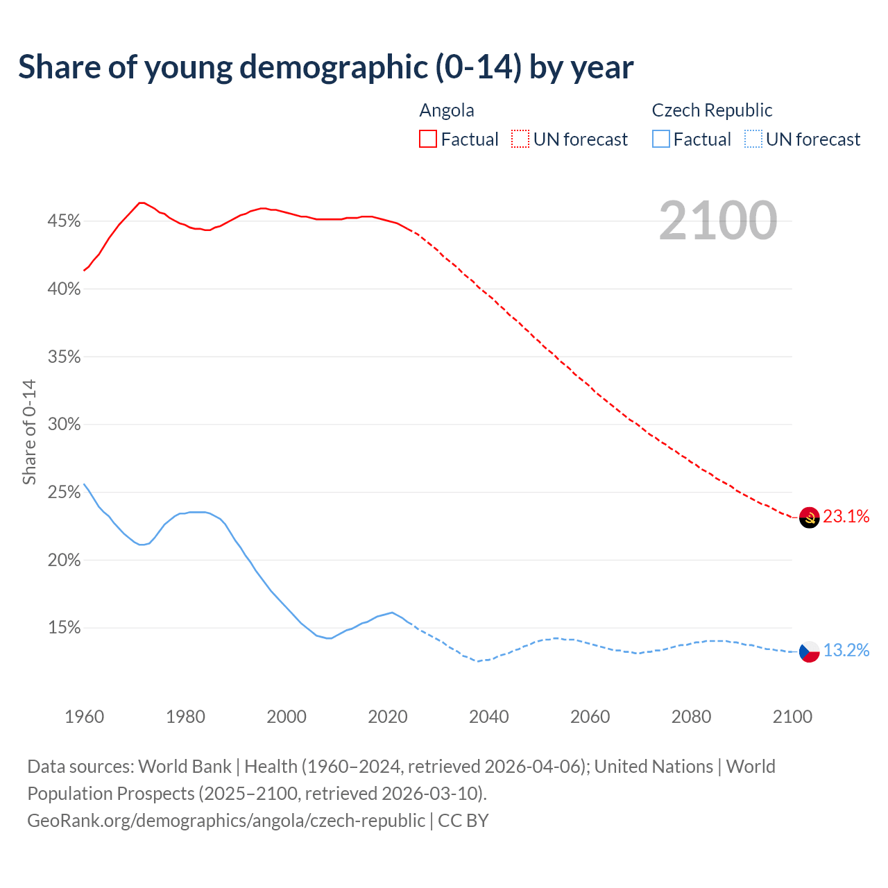 - The share of young demographic (0-15 years old) in Angola is 44.4% vs 15.4% in the Czech Republic.