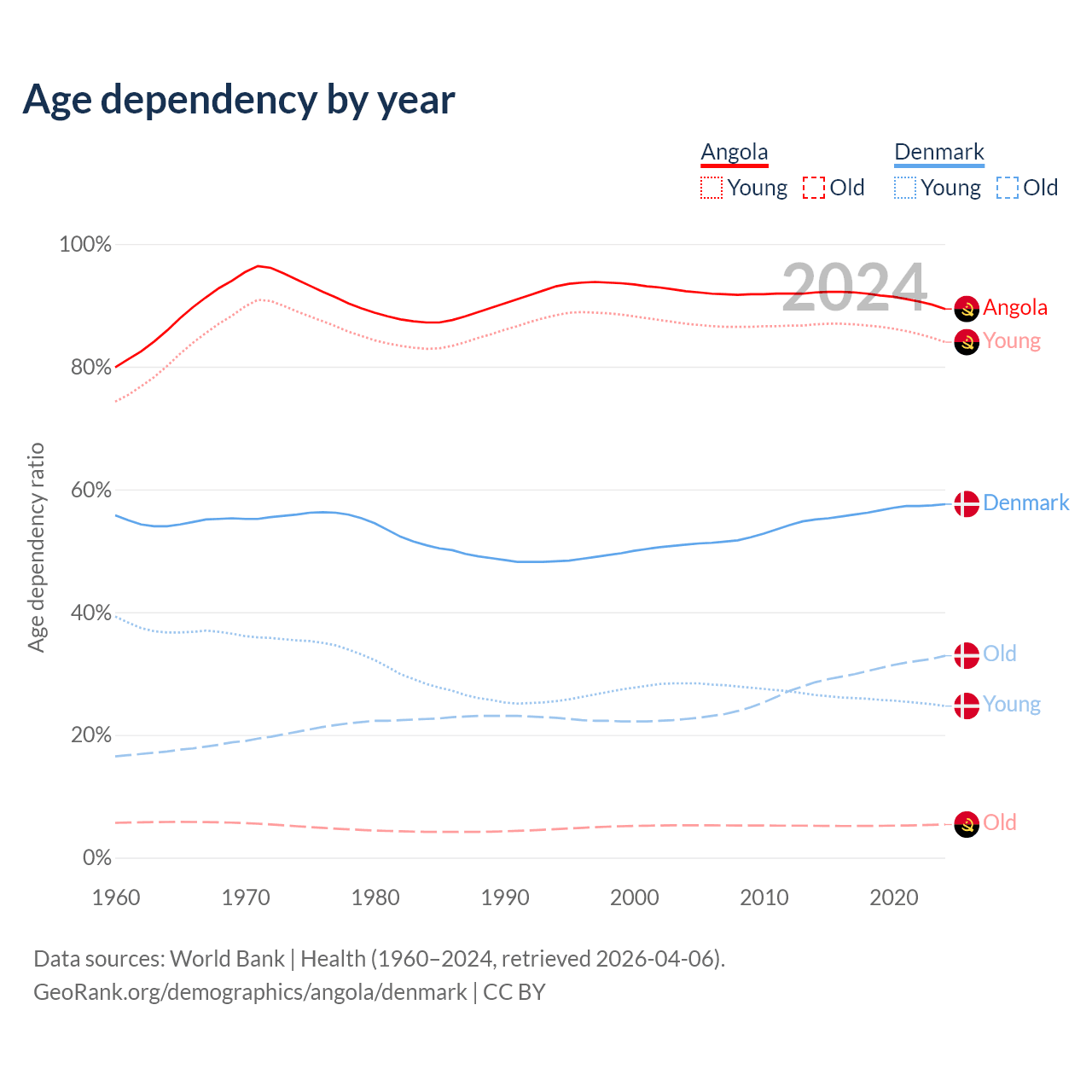 Demographics of Angola compared to Denmark: