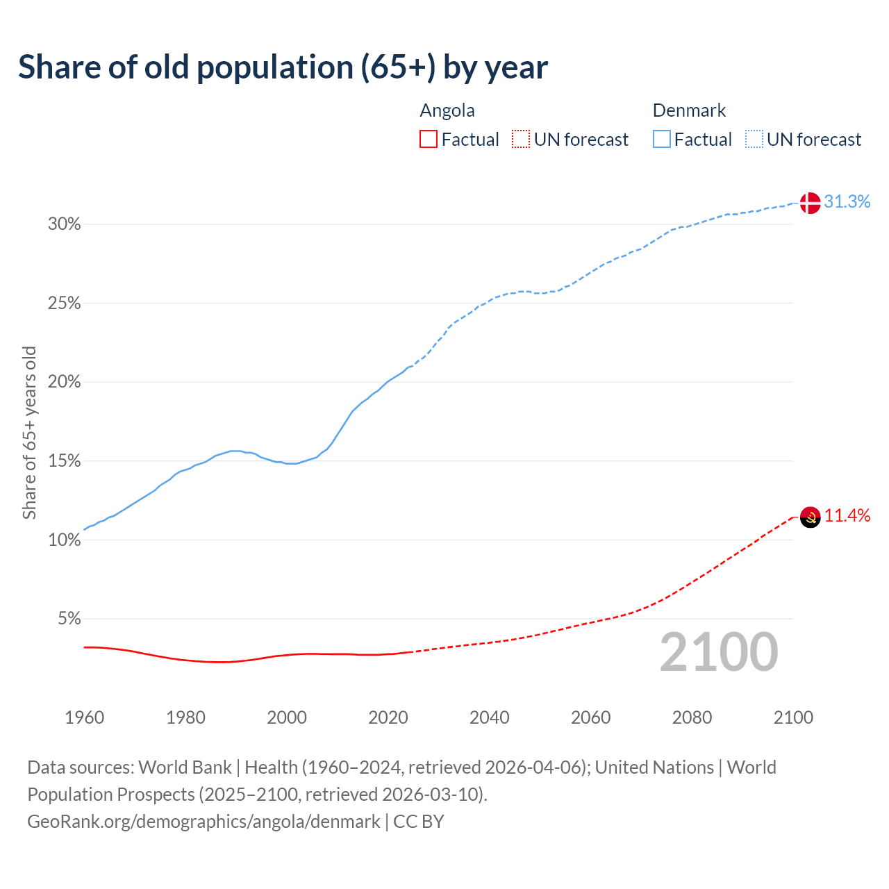 The share of older people aged 65 and over is 2.85% in Angola and 20.9% in Denmark. Life expectancy in Angola compared to Denmark .