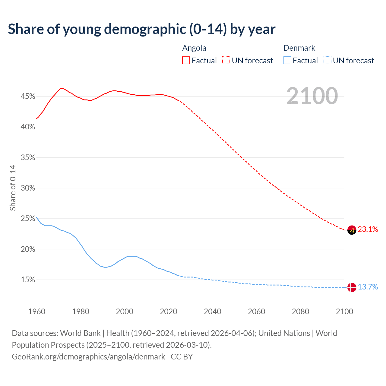 - The share of young demographic (0-15 years old) in Angola is 44.4% vs 15.7% in Denmark.