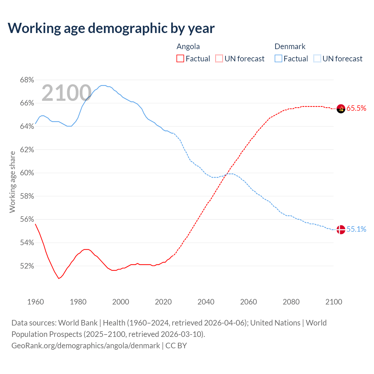 - Angola has 21.4M working age adults (aged 15-64) vs 3.83M in Denmark.