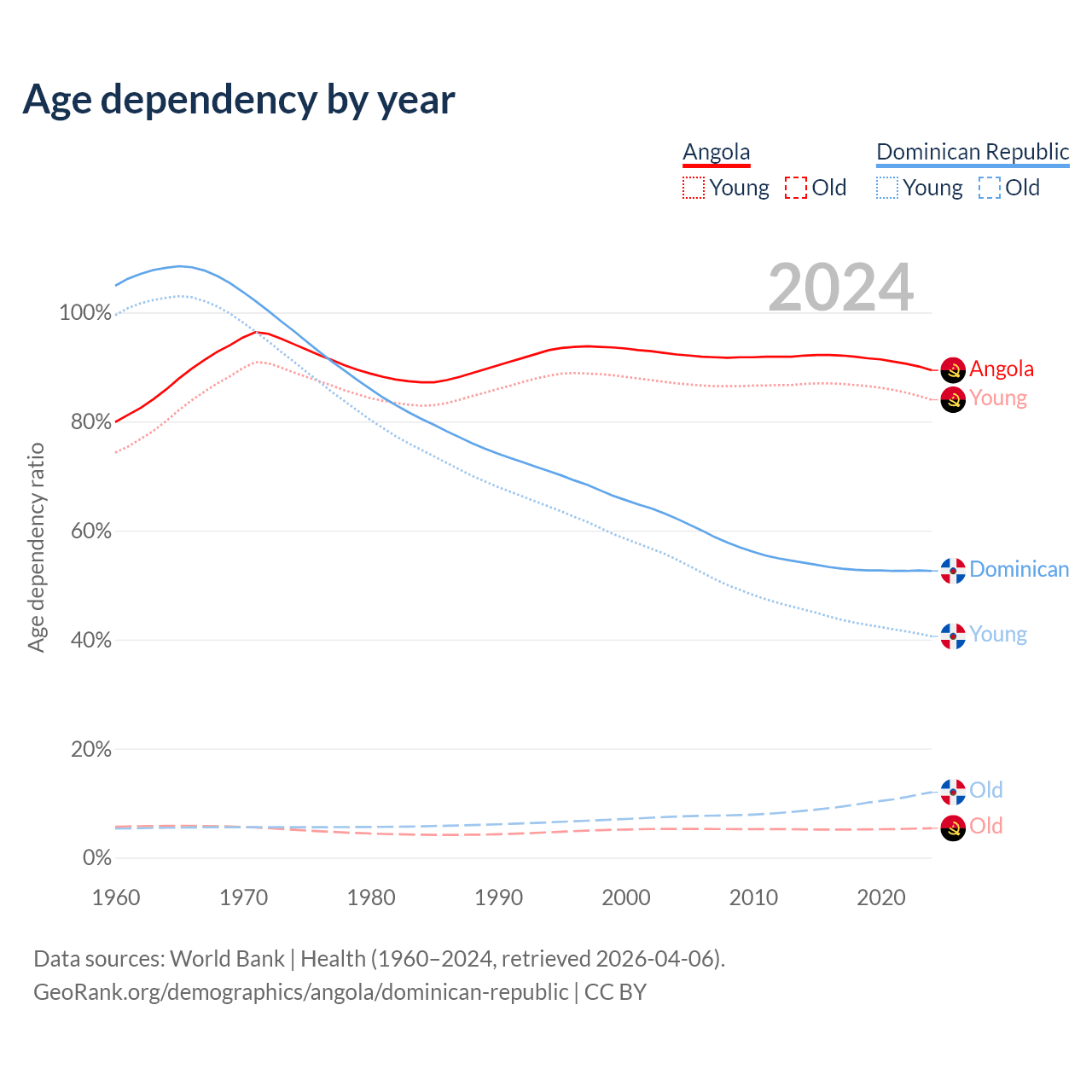 - Angola is ranked 188/196 by median age (oldest to youngest) vs 112/196 for the Dominican Republic.