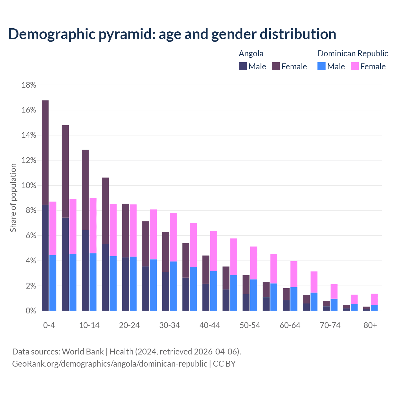 - As of 2026, the population of Angola is 40.6M vs 11.6M in the Dominican Republic - 3.48 times difference.