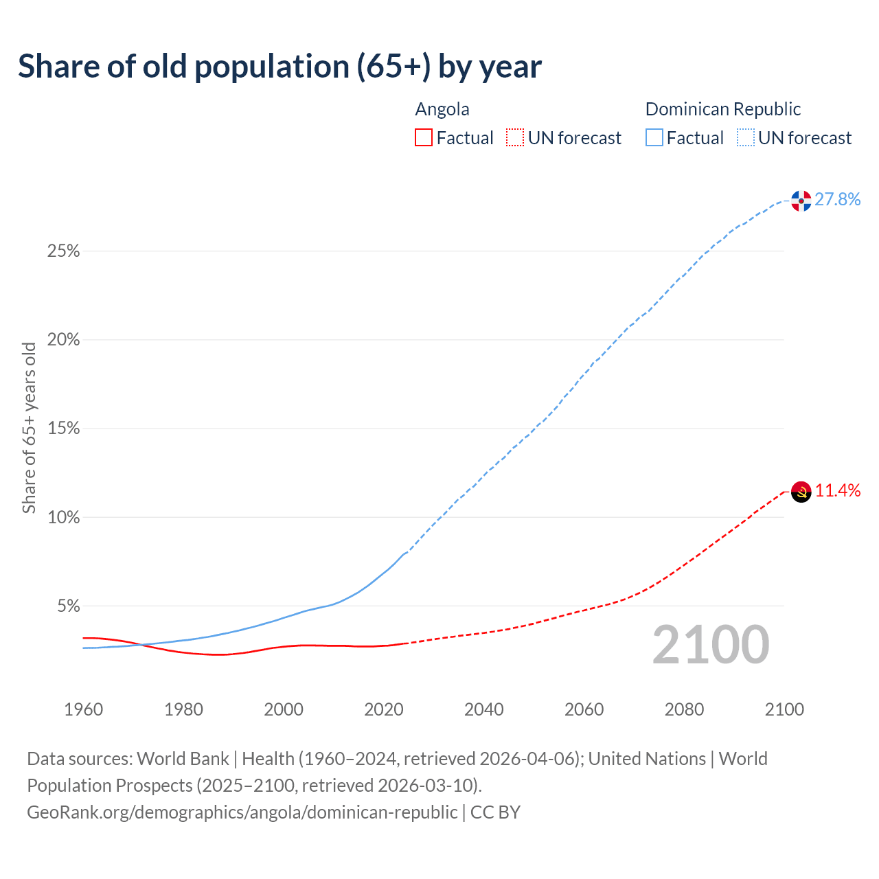The share of older people aged 65 and over is 2.85% in Angola and 7.88% in the Dominican Republic. Life expectancy in Angola compared to the Dominican Republic .