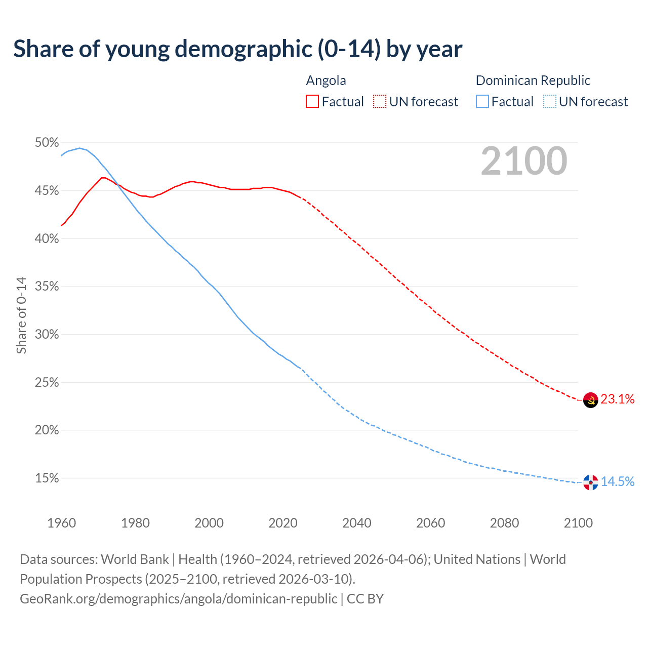 - The share of young demographic (0-15 years old) in Angola is 44.4% vs 26.6% in the Dominican Republic.