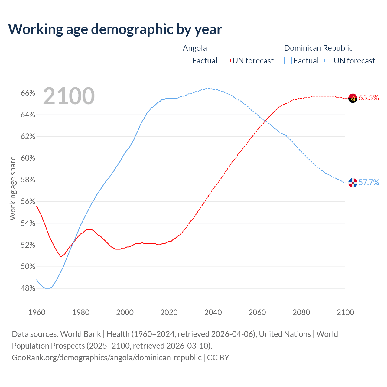 - Angola has 21.4M working age adults (aged 15-64) vs 7.63M in the Dominican Republic.